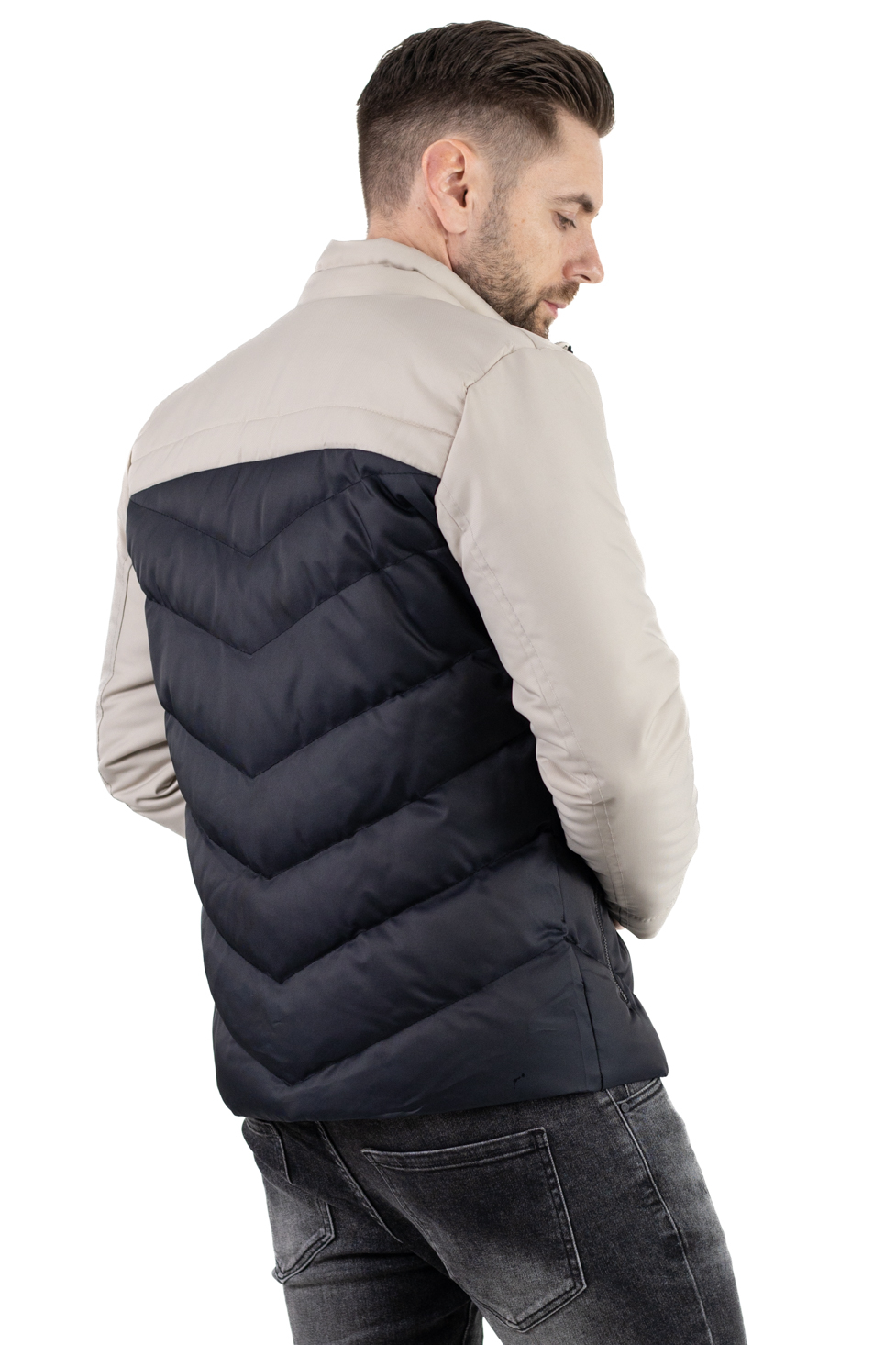 Geaca matlasata pentru barbati din doua culori negru si crem, inchidere cu fermoar, model drept in talie, doua buzunare exterioare cu fermoar si un buzunar interior. Material impermeabil, potrivita ca si grosime pentru primavara-toamna.