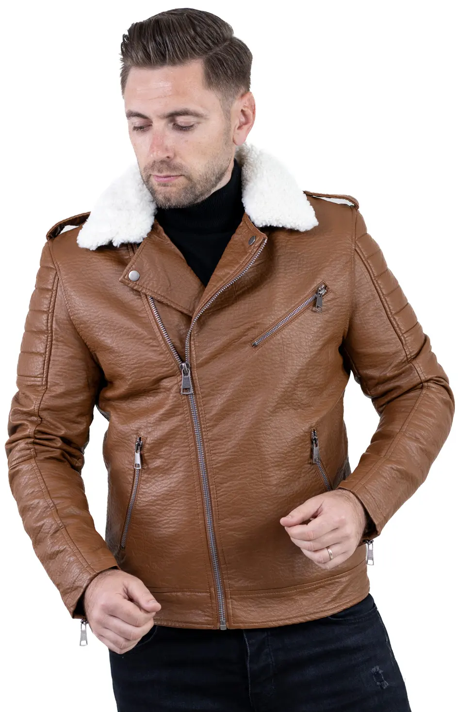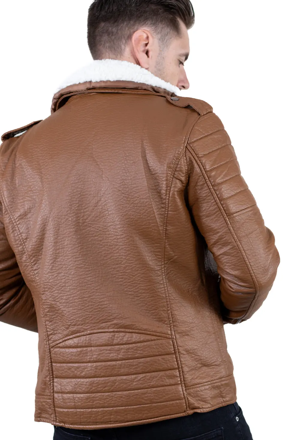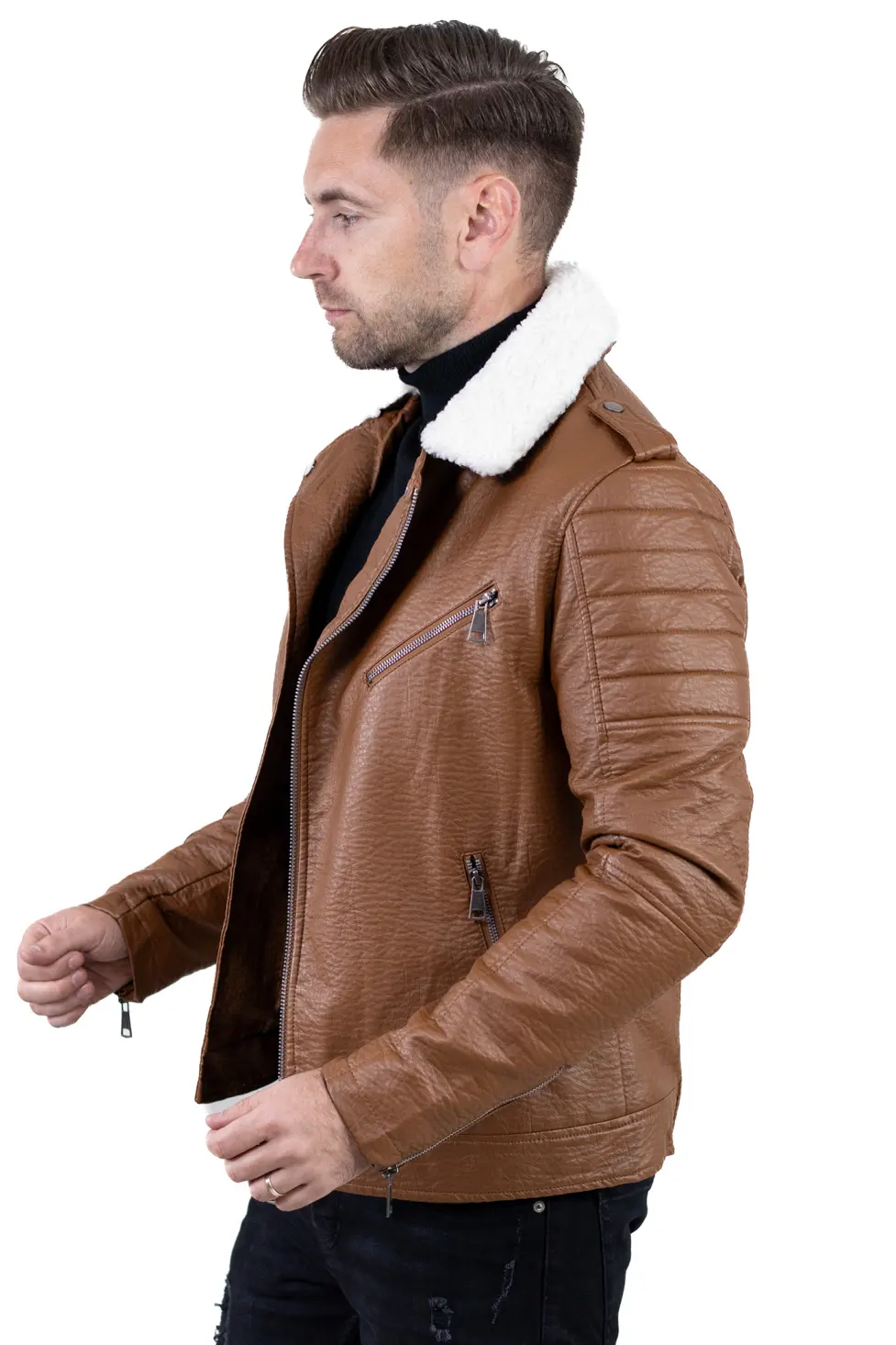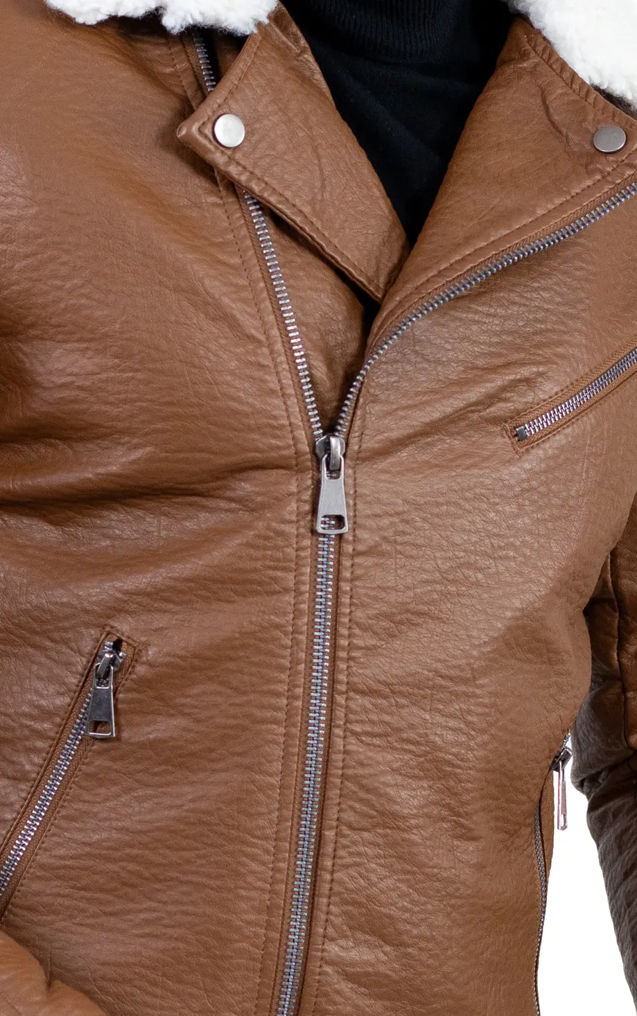 Geacă bărbătească din piele ecologică, cu finisaj texturat și guler îmblănit, concepută pentru zilele reci în care vrei să te simți protejat, dar fără să renunți la un look modern. Croiul este inspirat din stilul biker, cu linii ferme, umeri matlasați și fermoare metalice vizibile, detalii care o scot imediat din zona banalului.