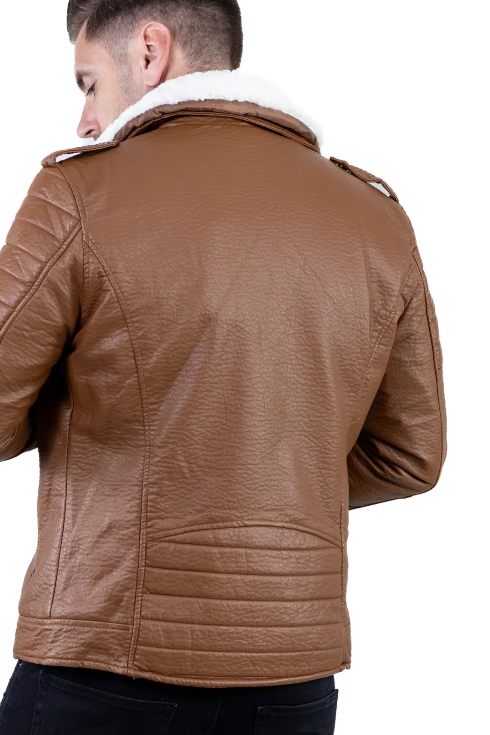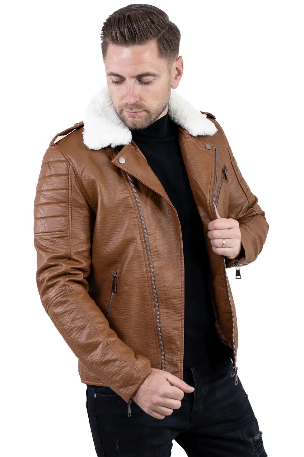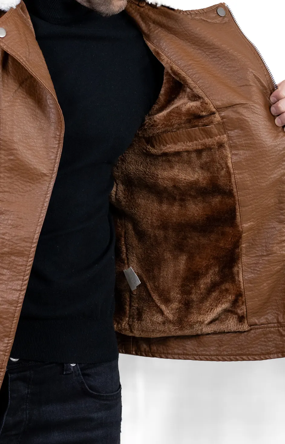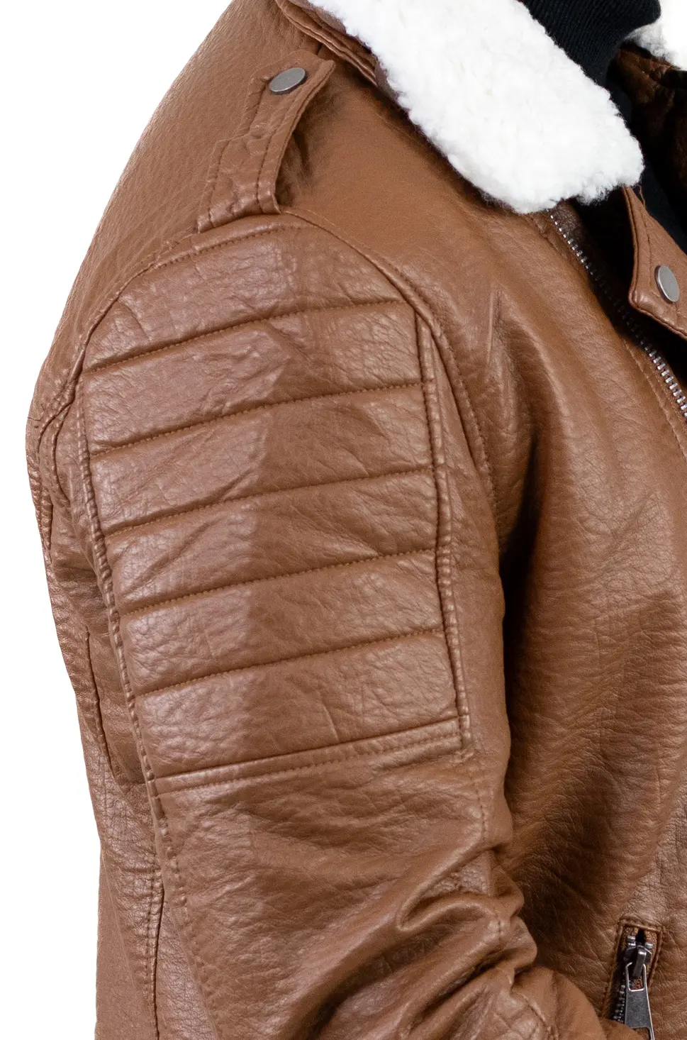 Geacă bărbătească din piele ecologică, cu finisaj texturat și guler îmblănit, concepută pentru zilele reci în care vrei să te simți protejat, dar fără să renunți la un look modern. Croiul este inspirat din stilul biker, cu linii ferme, umeri matlasați și fermoare metalice vizibile, detalii care o scot imediat din zona banalului.