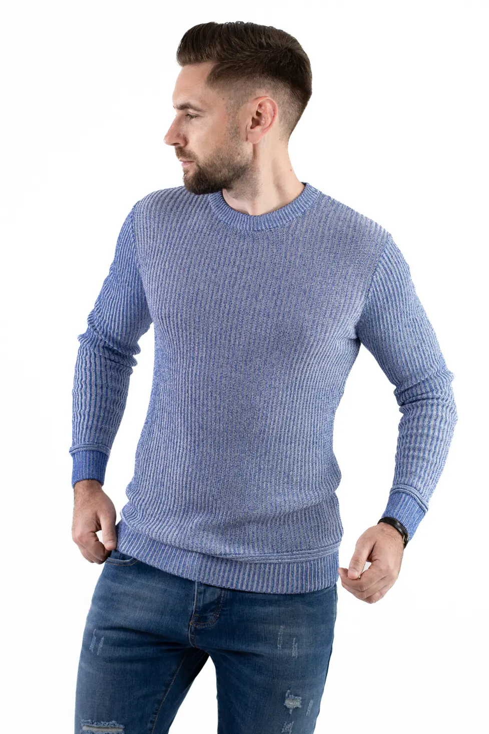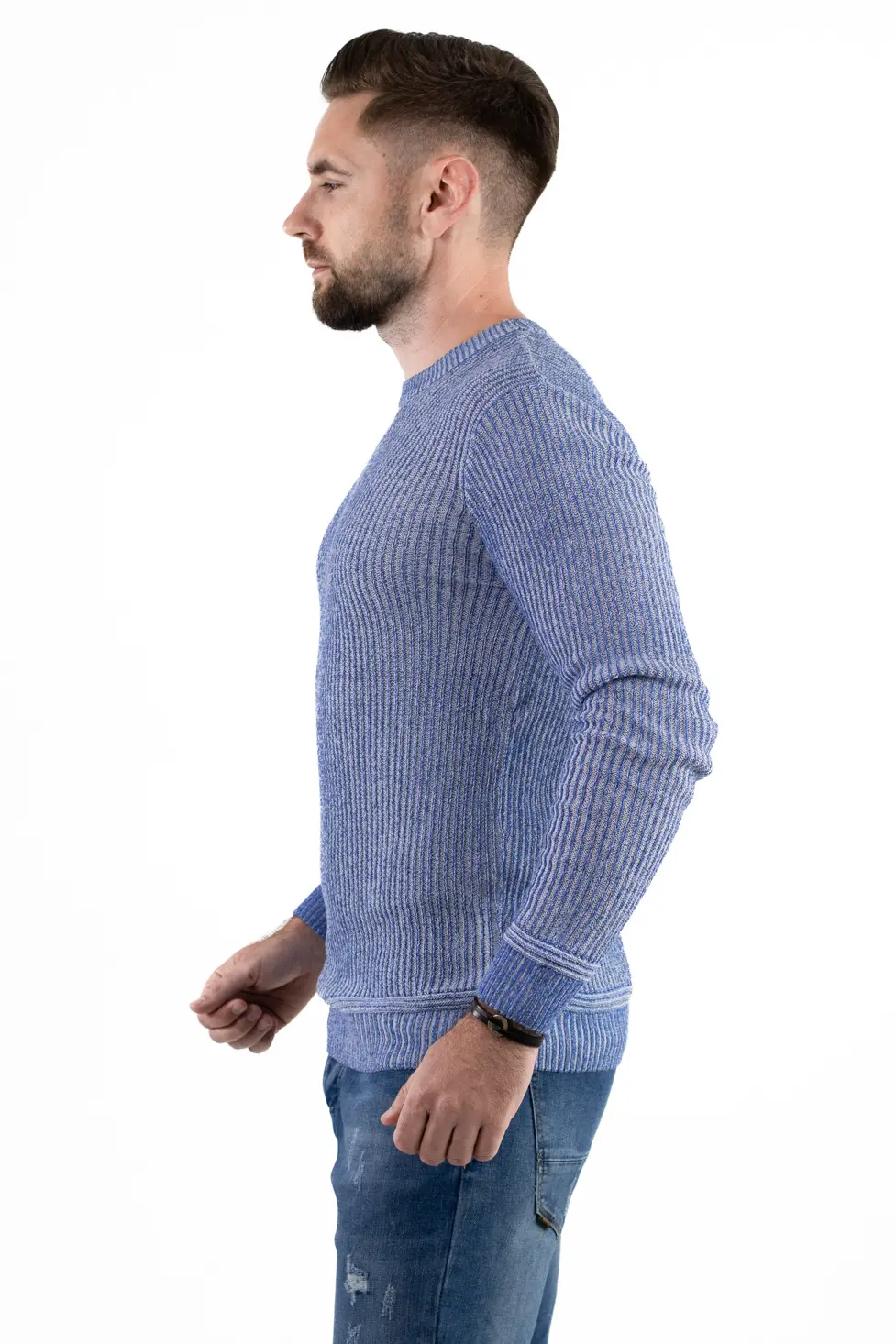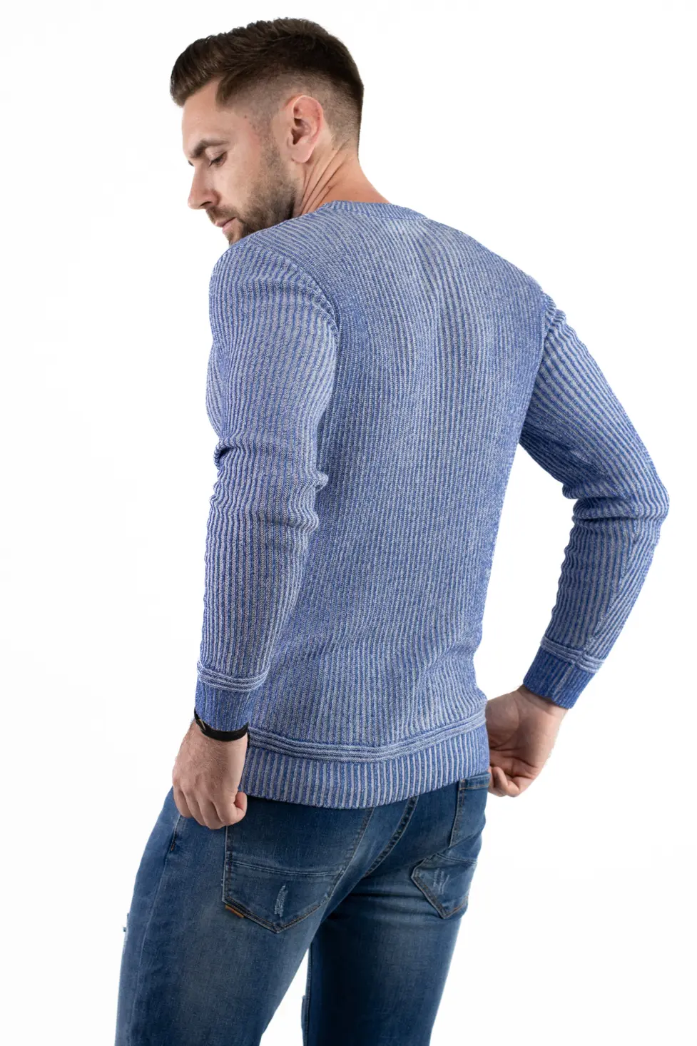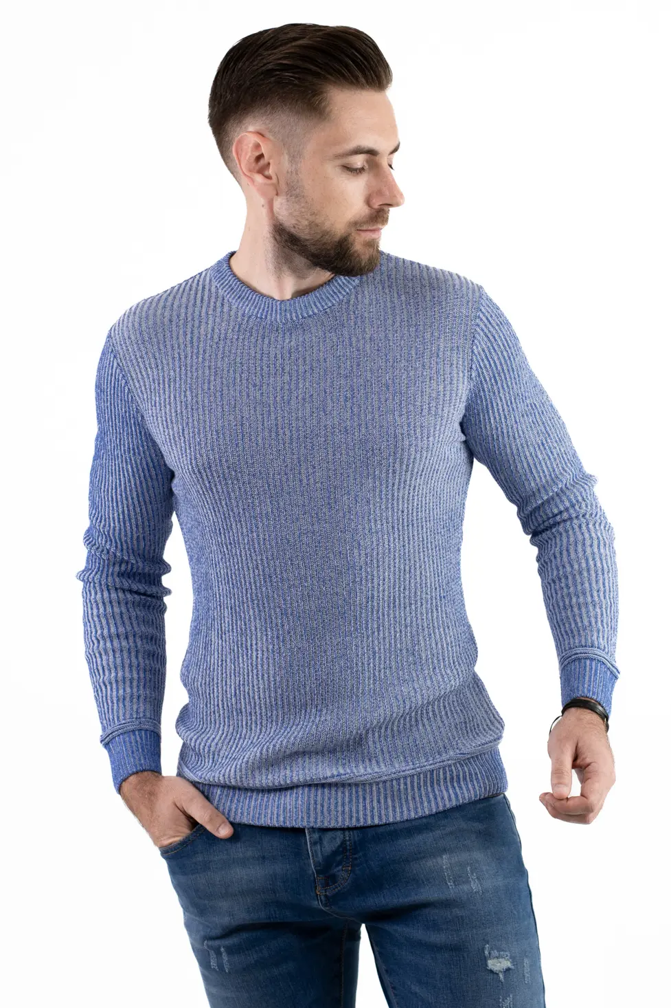 Pulover barbati din material tricotat. Extrem de comod si placut la atingere, material elastic. Guler rotund. Culoare albastru. Mânecă lungă.