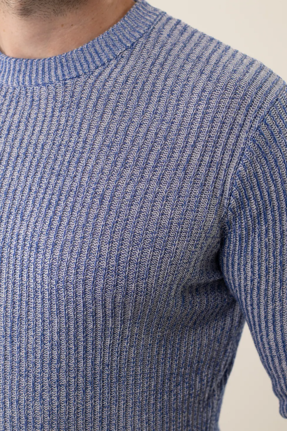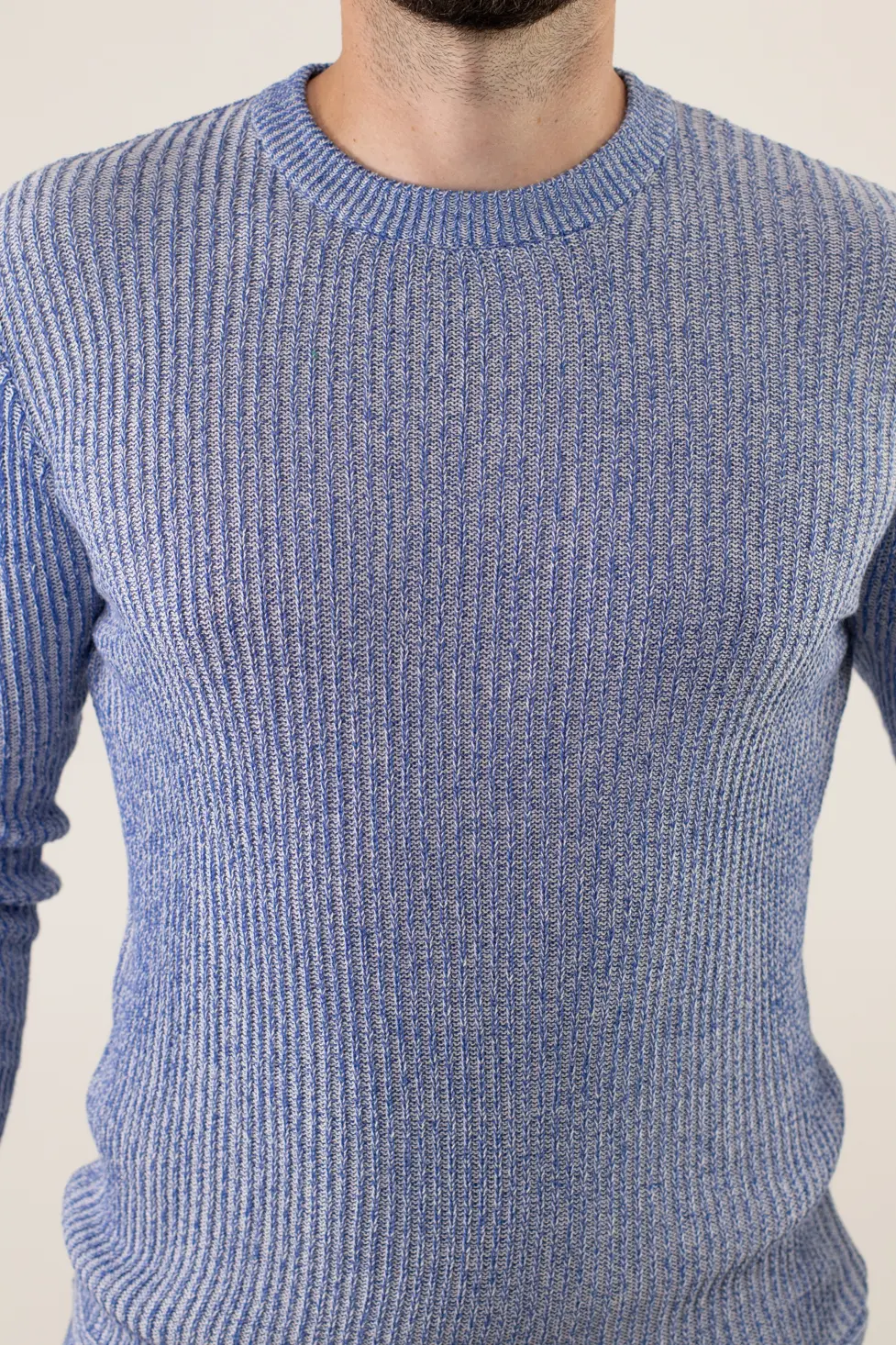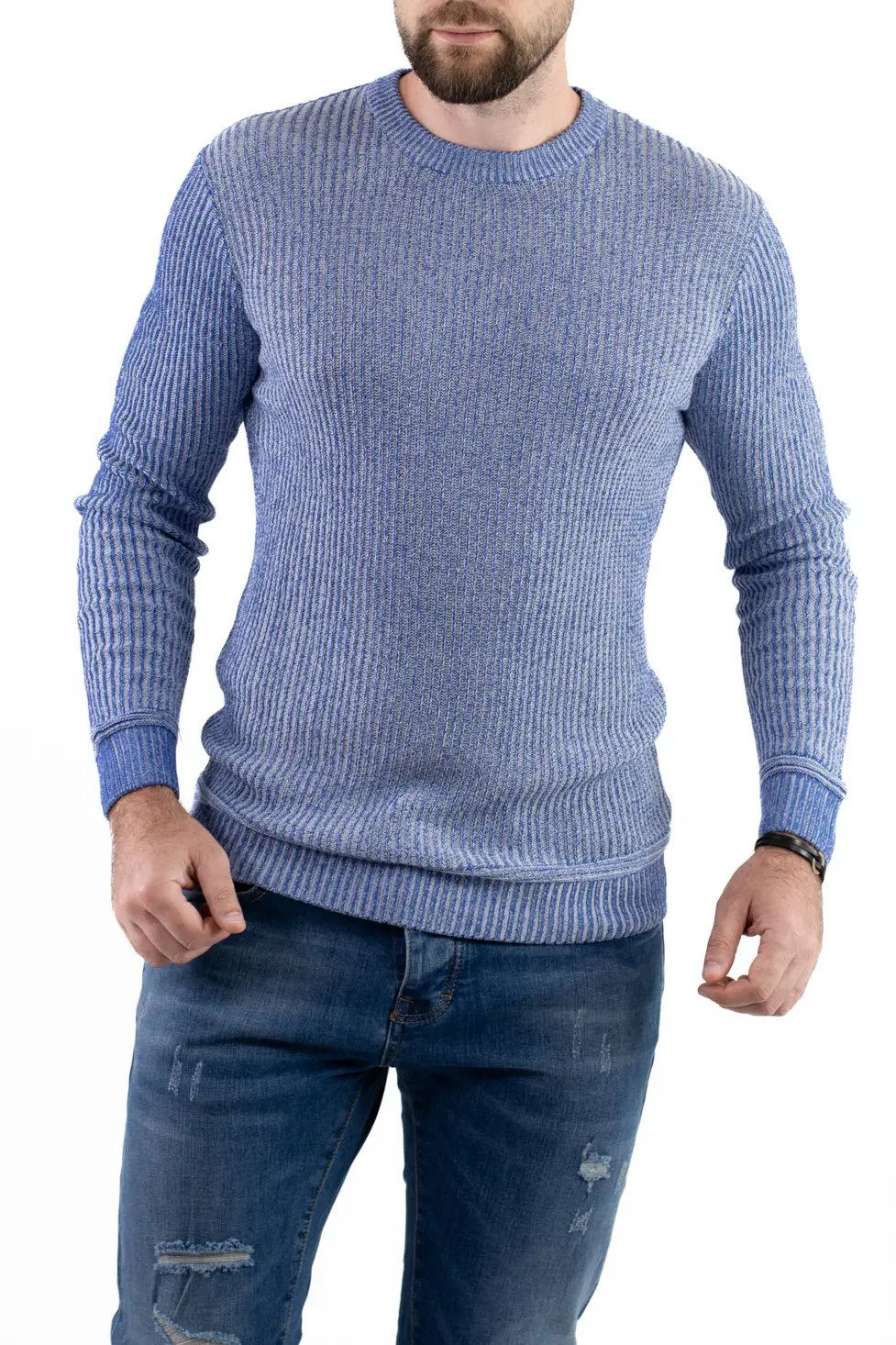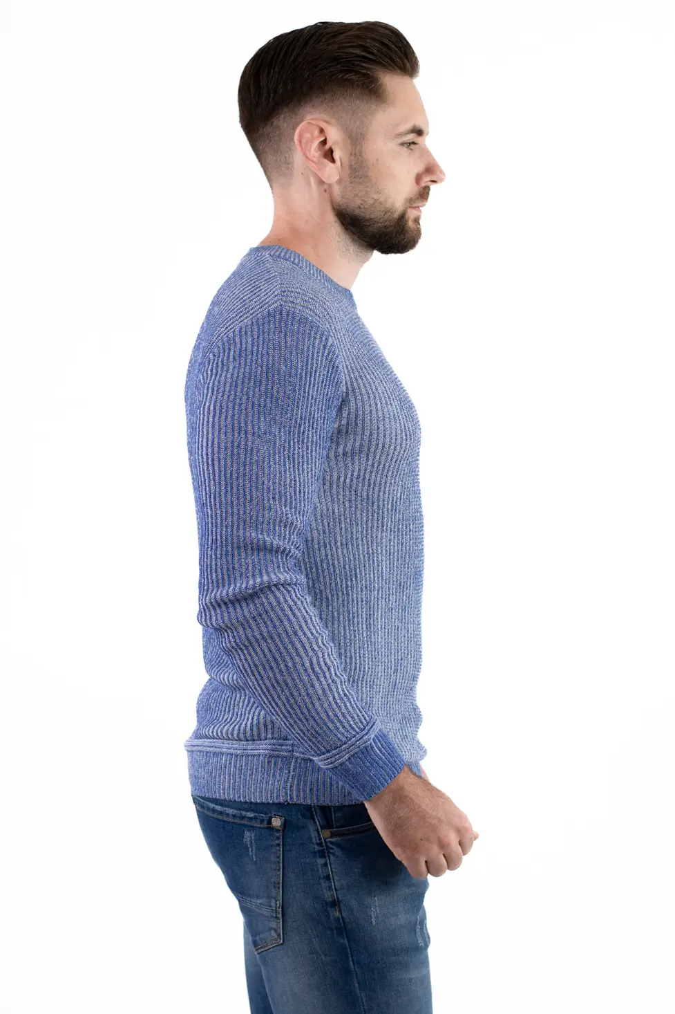 Pulover barbati din material tricotat. Extrem de comod si placut la atingere, material elastic. Guler rotund. Culoare albastru. Mânecă lungă.
