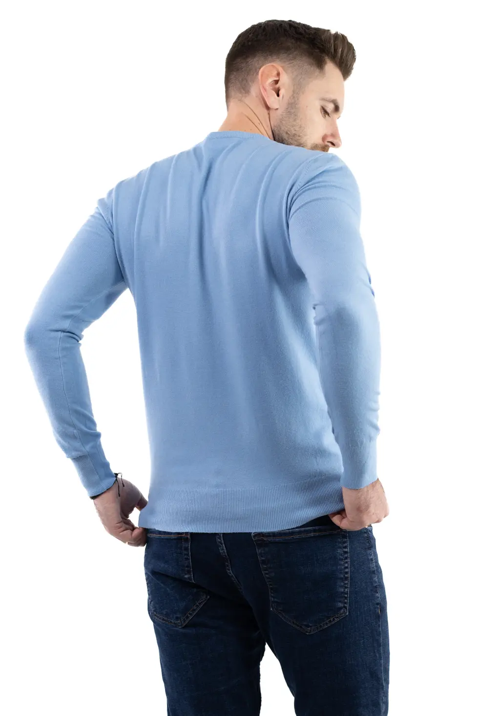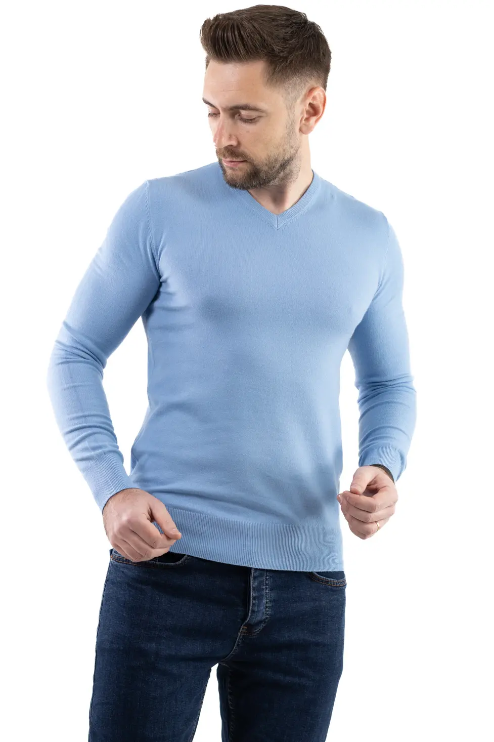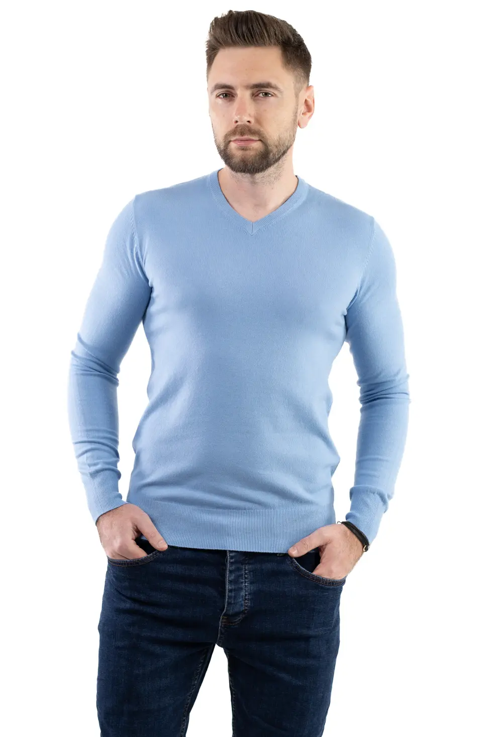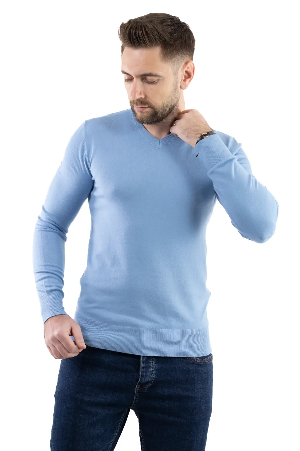 Pulover barbati cu guler in V albastru ciel
