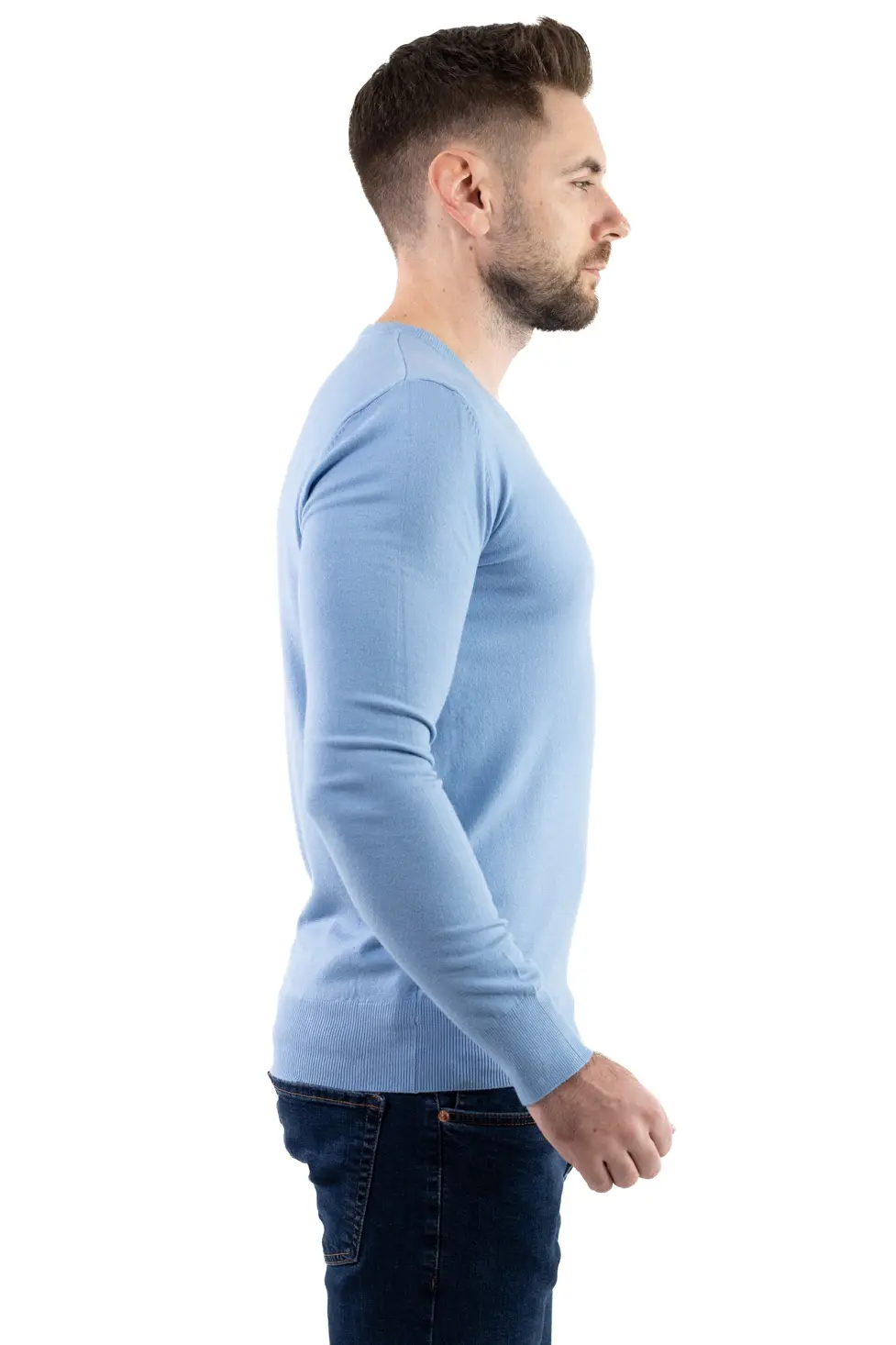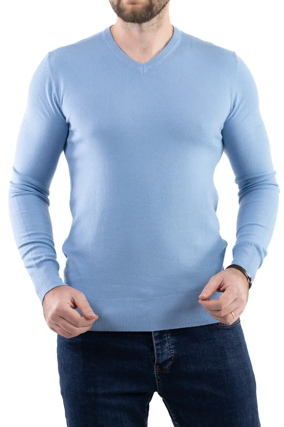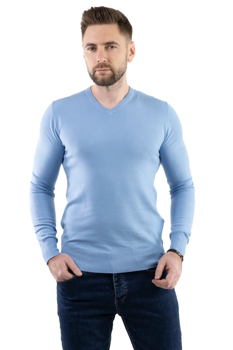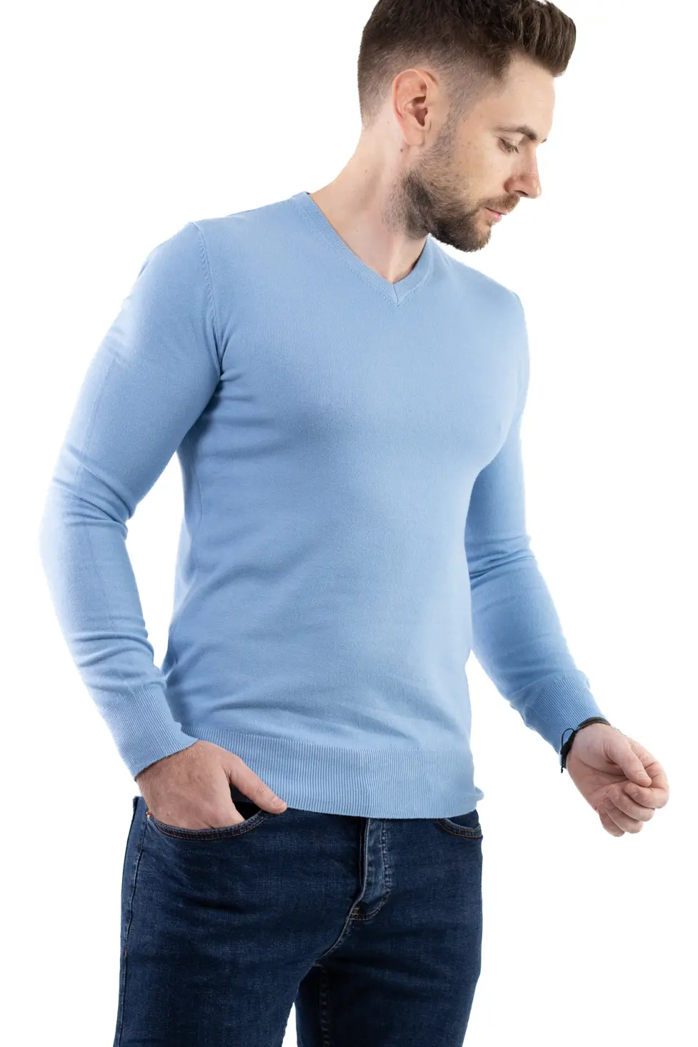 Pulover barbati cu guler in V albastru ciel