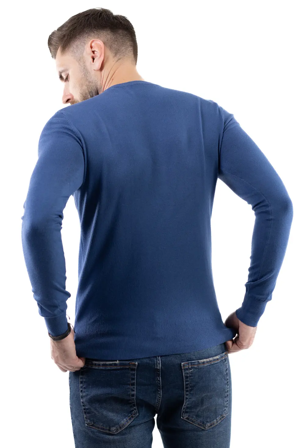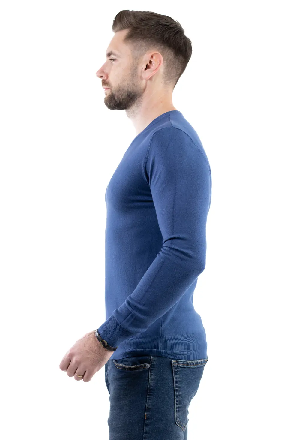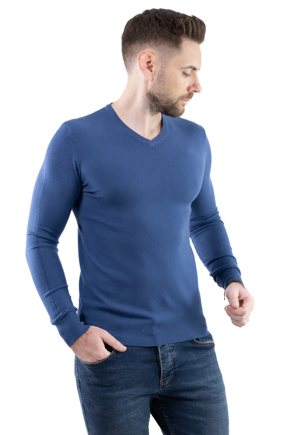 Pulover simplu cu croială slim fit. Guler in V. Culoare albastru denim. Mânecă lungă. Material foarte fin la atingere, tip cașmir. Foarte confortabil datorita elasticitatii.