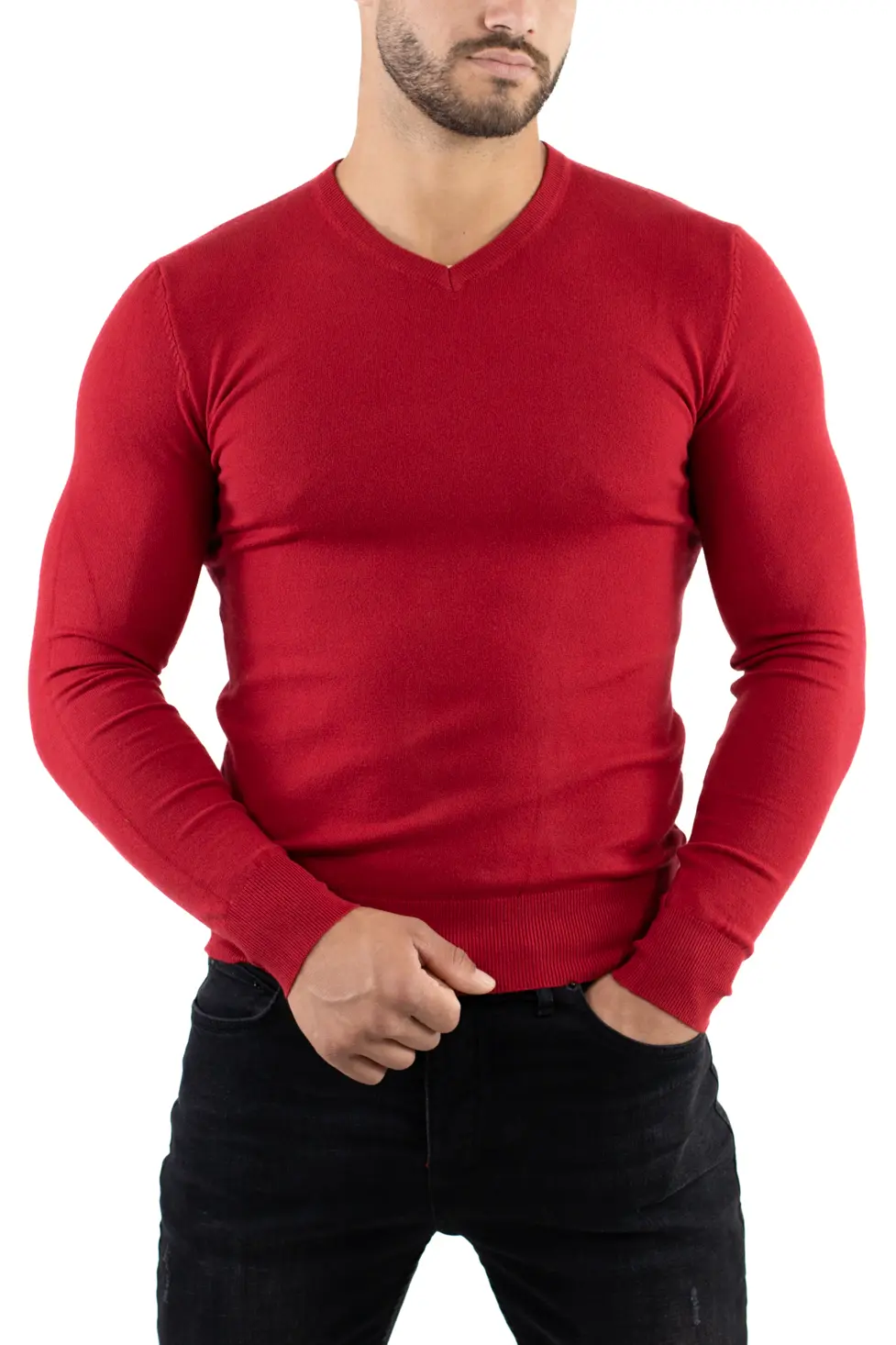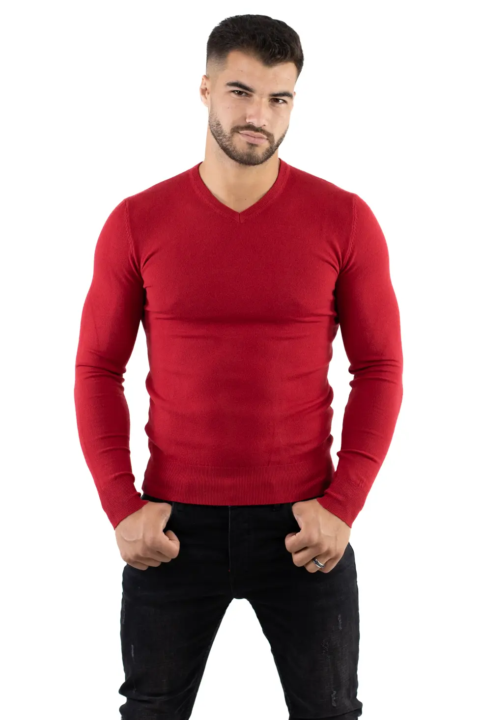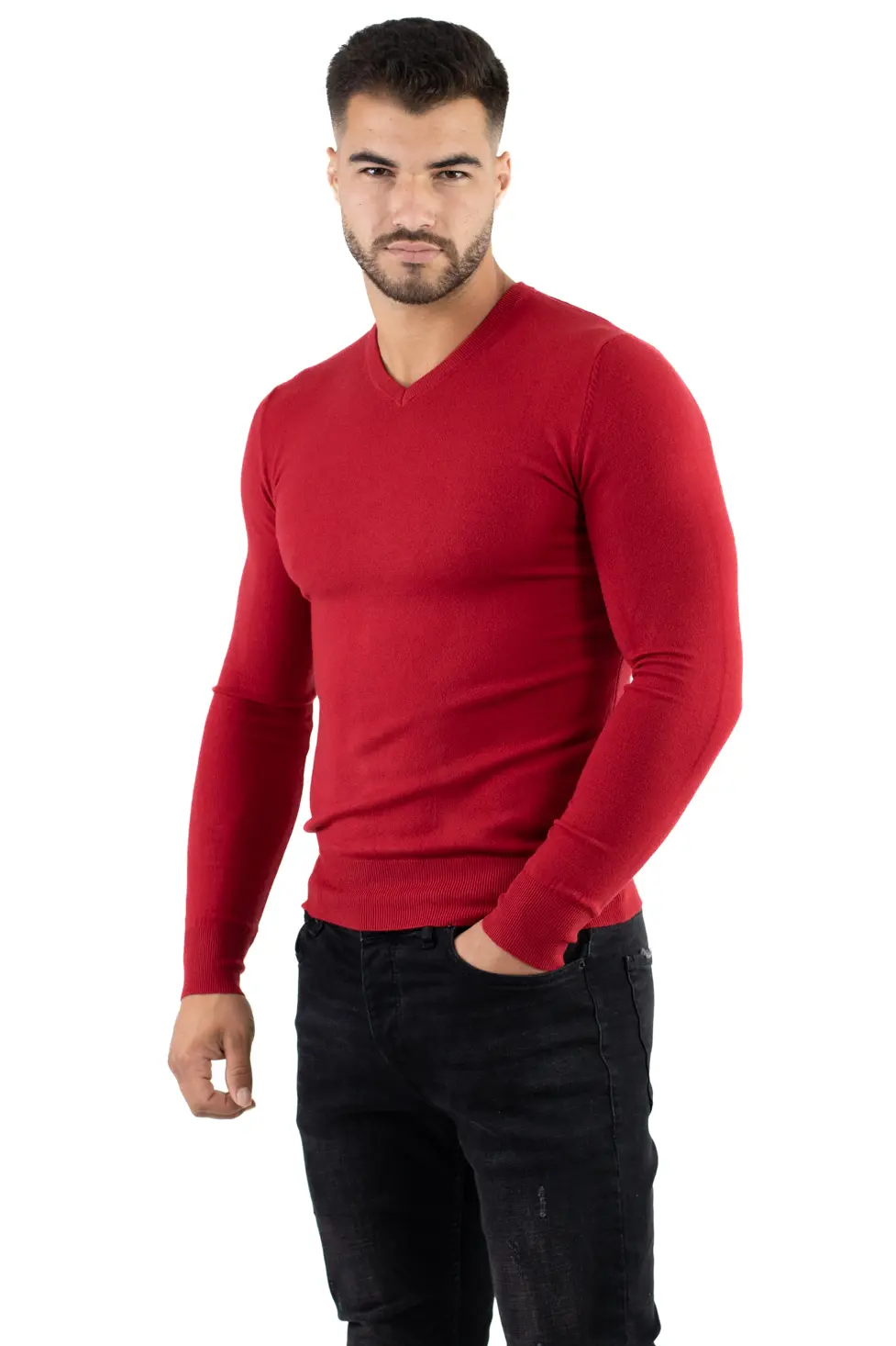 Pulover simplu cu croială slim fit. Guler in V. Culoare rosu. Mânecă lungă. Material foarte fin la atingere, tip cașmir. Foarte confortabil datorita elasticitatii.