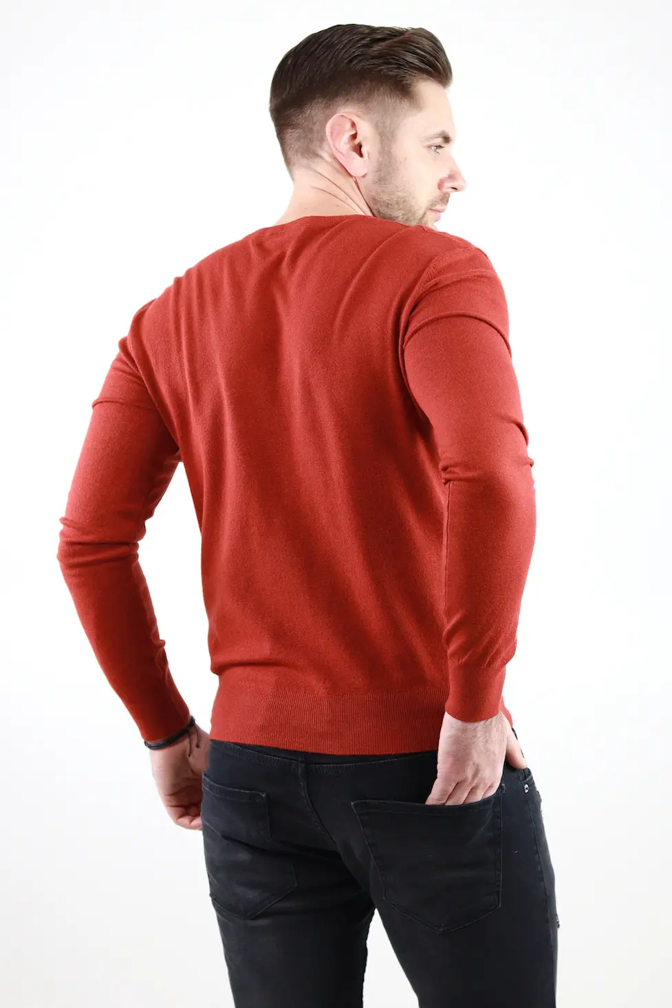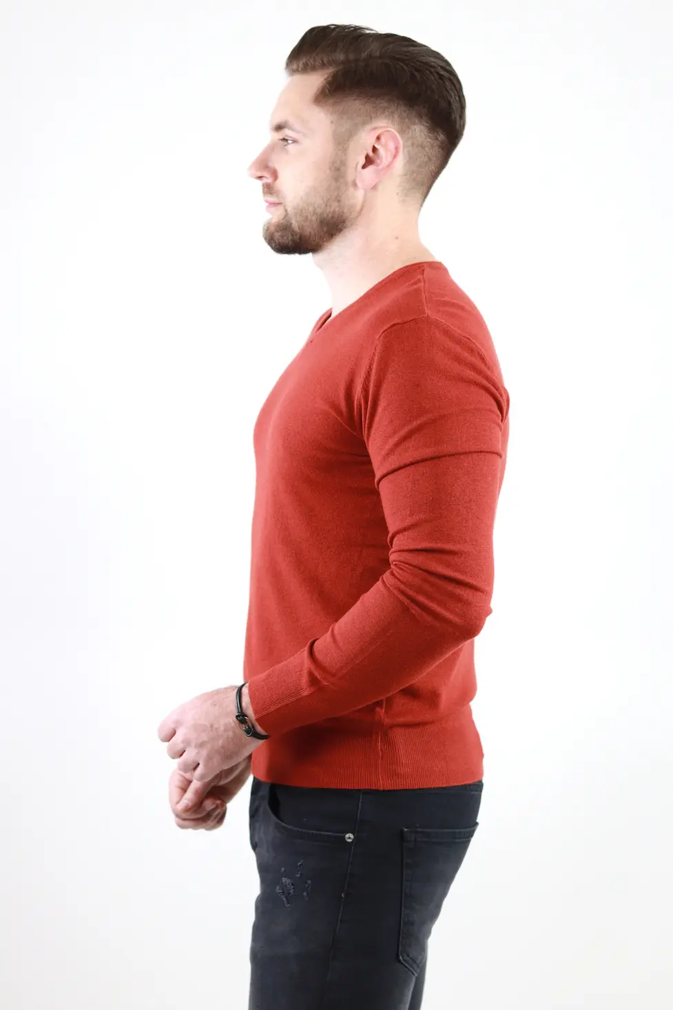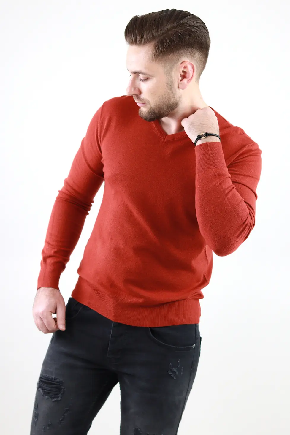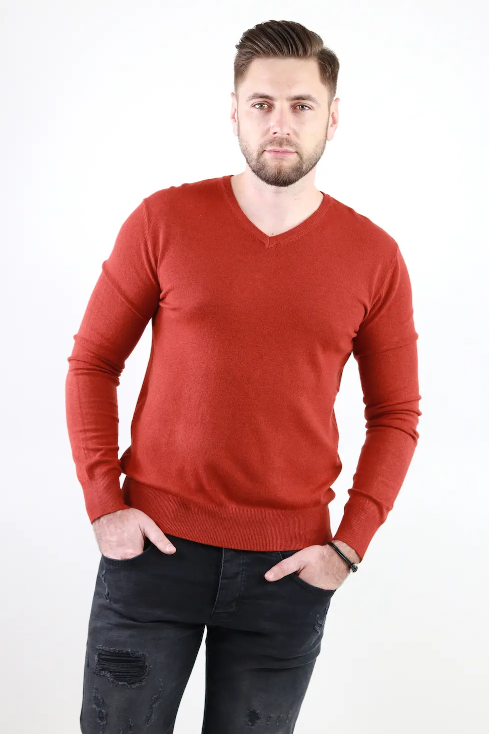Pulover simplu cu croială slim fit. Guler in V. Culoare caramiziu. Mânecă lungă. Material foarte fin la atingere, tip cașmir. Foarte confortabil datorita elasticitatii.
