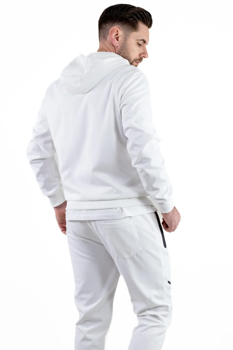 Trening pentru bărbați, format din hanorac cu glugă și pantaloni asortați, conceput pentru confort și mobilitate în purtarea zilnică. Realizat din material elastic, cu textură fină și plăcută la atingere, se adaptează bine corpului fără a limita mișcarea. Croiala este echilibrată, potrivită atât pentru activități relaxate, cât și pentru ținute casual urbane.