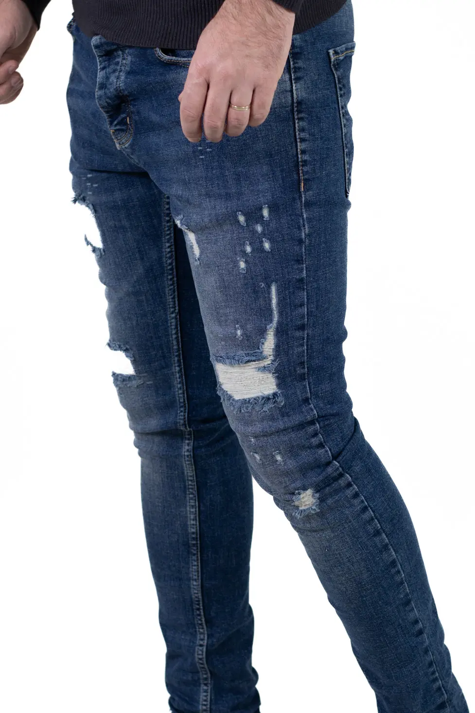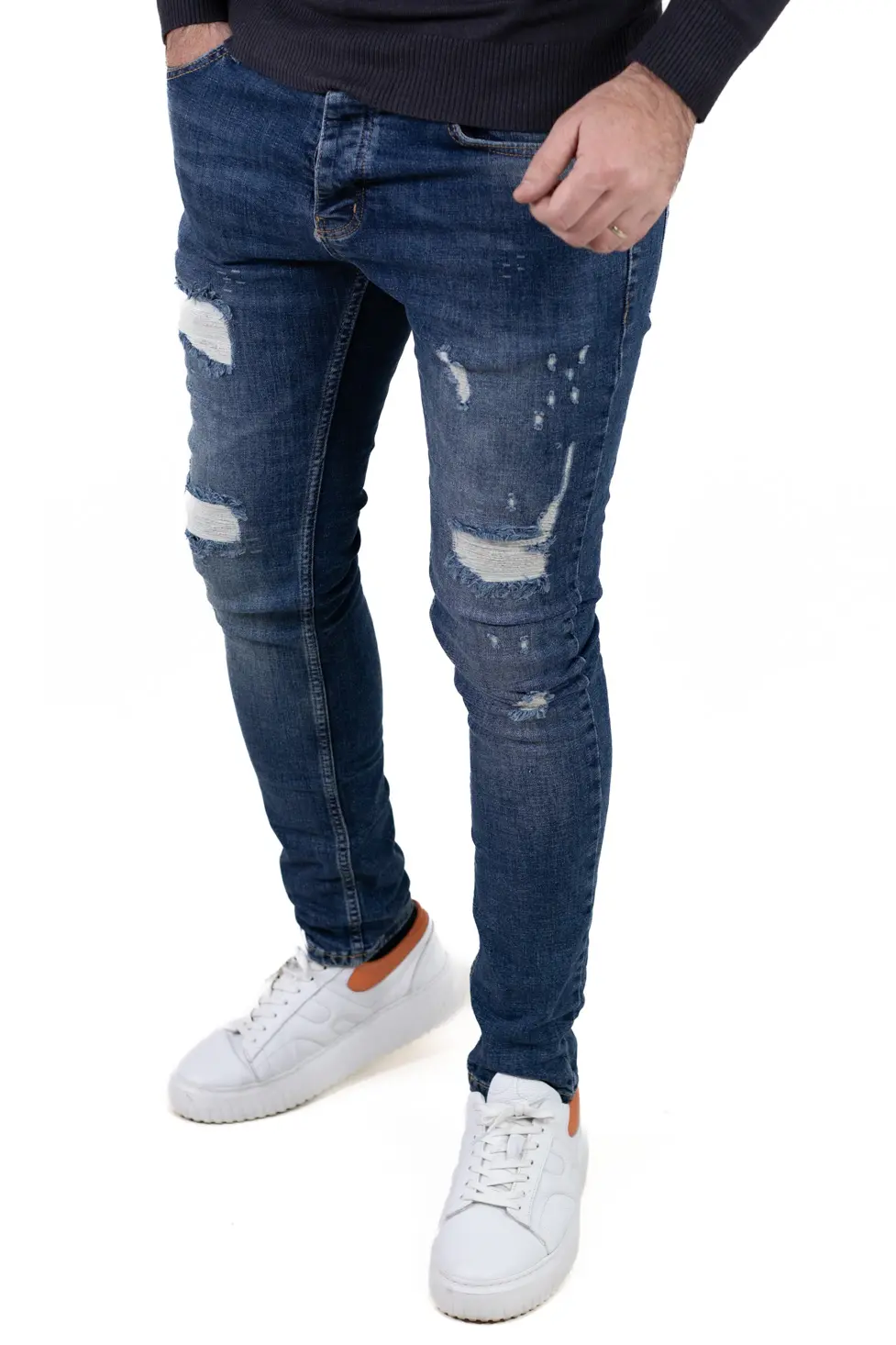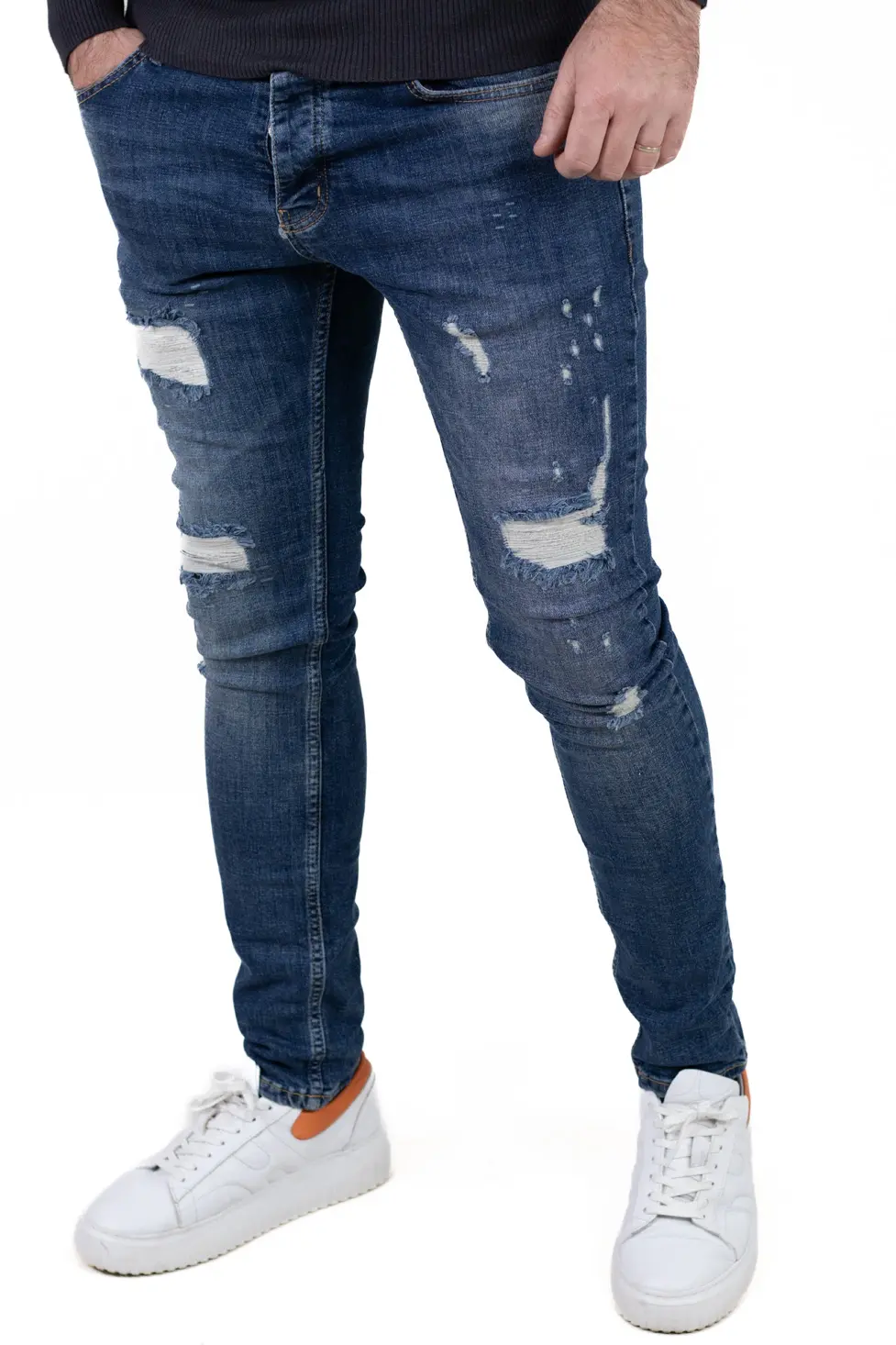 Blugi pentru bărbați cu croială regular fit, realizați din denim albastru prespălat, cu efect ușor uzat și rupturi decorative în contrast alb. Fiecare ruptură este acoperită pe interior, astfel încât pielea nu este expusă, oferind un plus de confort și protecție în sezonul rece. Modelul îmbină aspectul modern cu funcționalitatea necesară purtării zilnice.