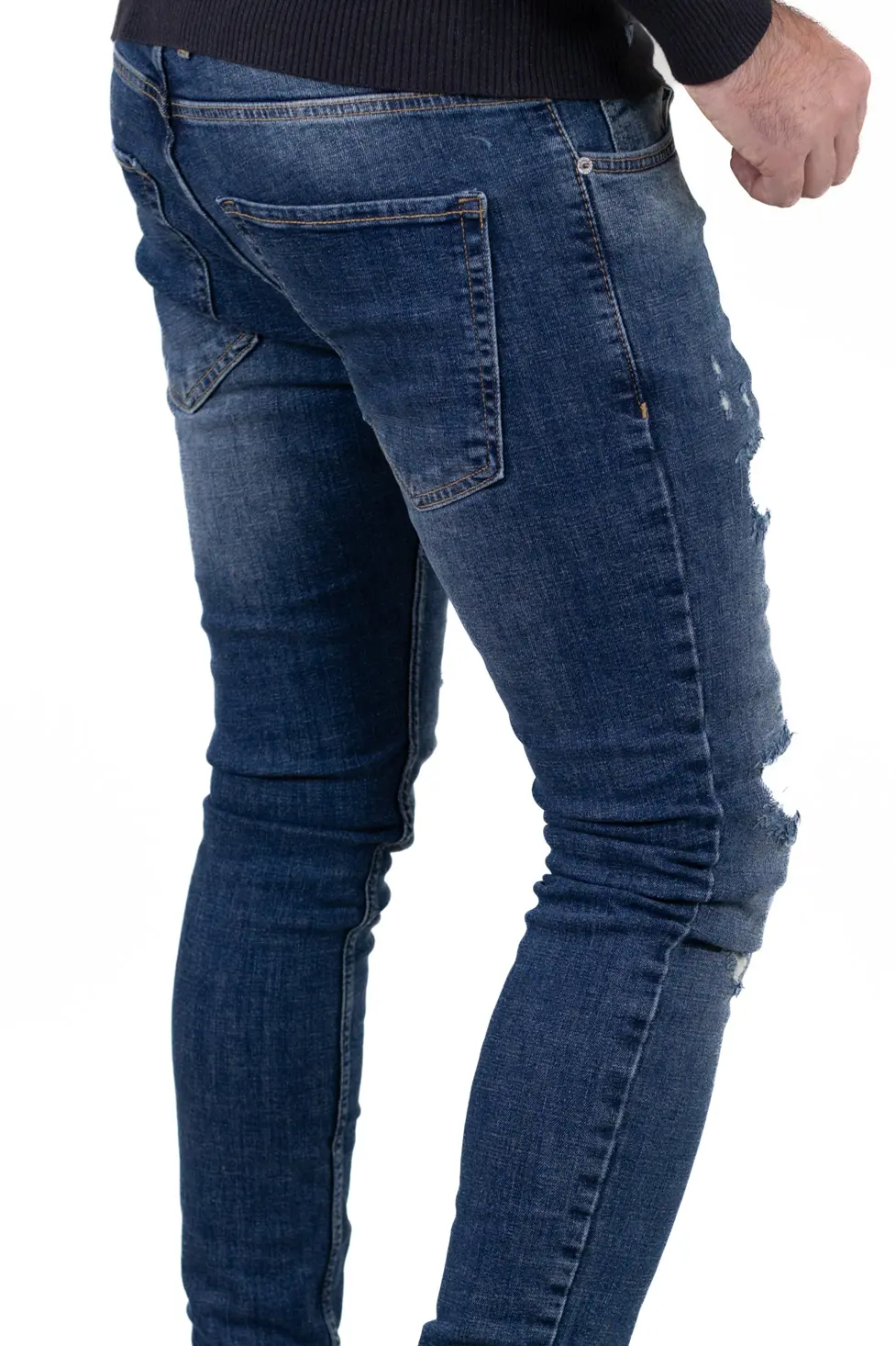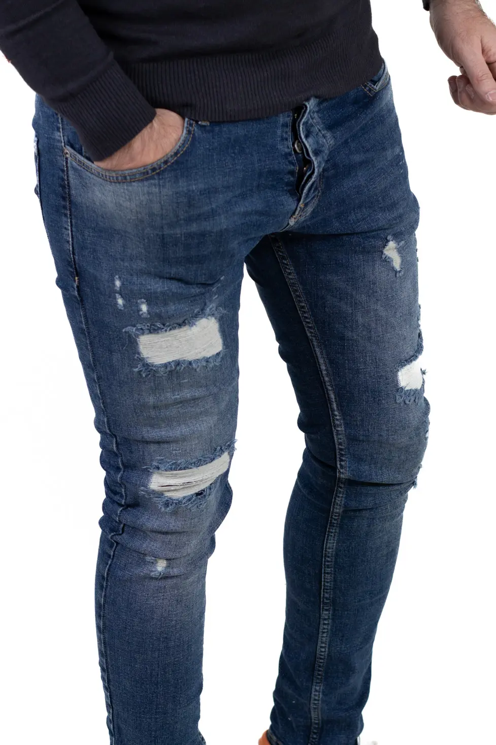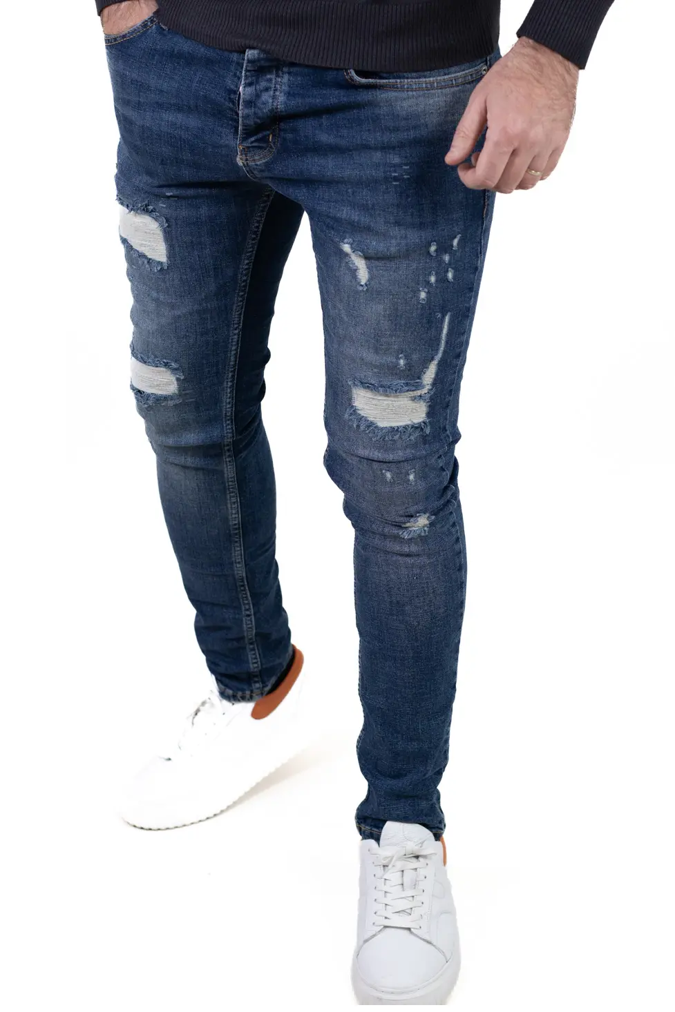Blugi pentru bărbați cu croială regular fit, realizați din denim albastru prespălat, cu efect ușor uzat și rupturi decorative în contrast alb. Fiecare ruptură este acoperită pe interior, astfel încât pielea nu este expusă, oferind un plus de confort și protecție în sezonul rece. Modelul îmbină aspectul modern cu funcționalitatea necesară purtării zilnice.
