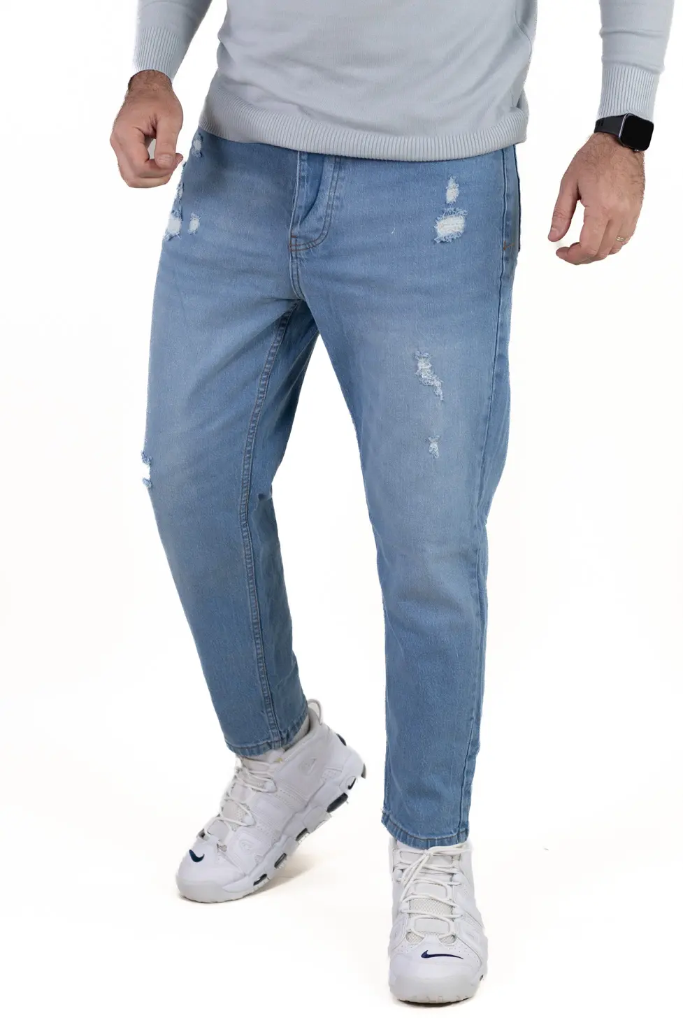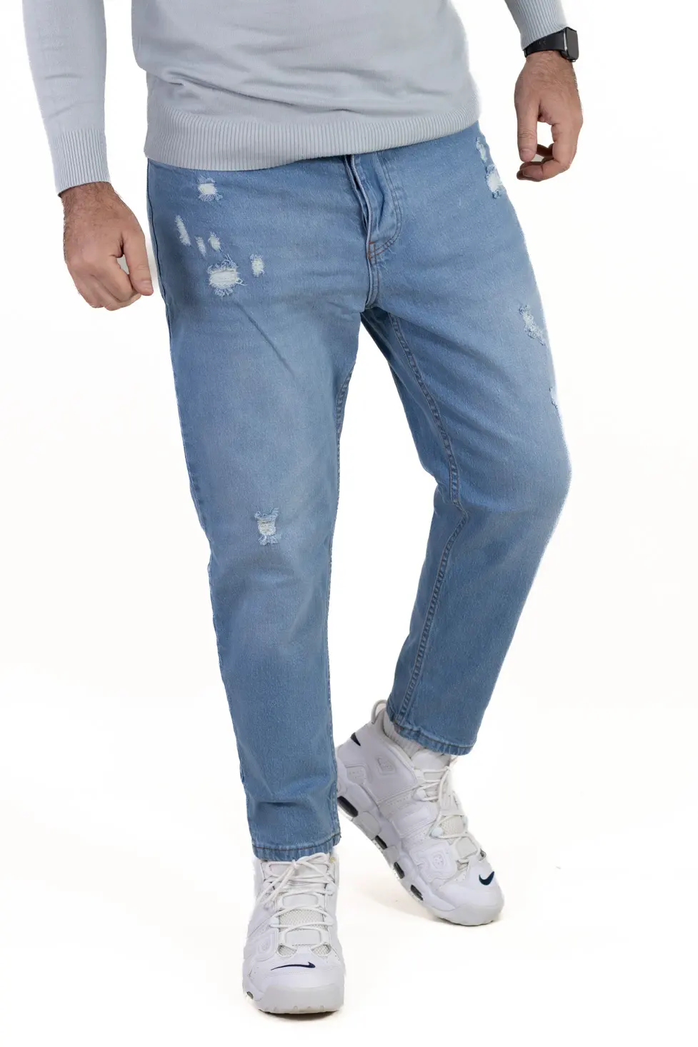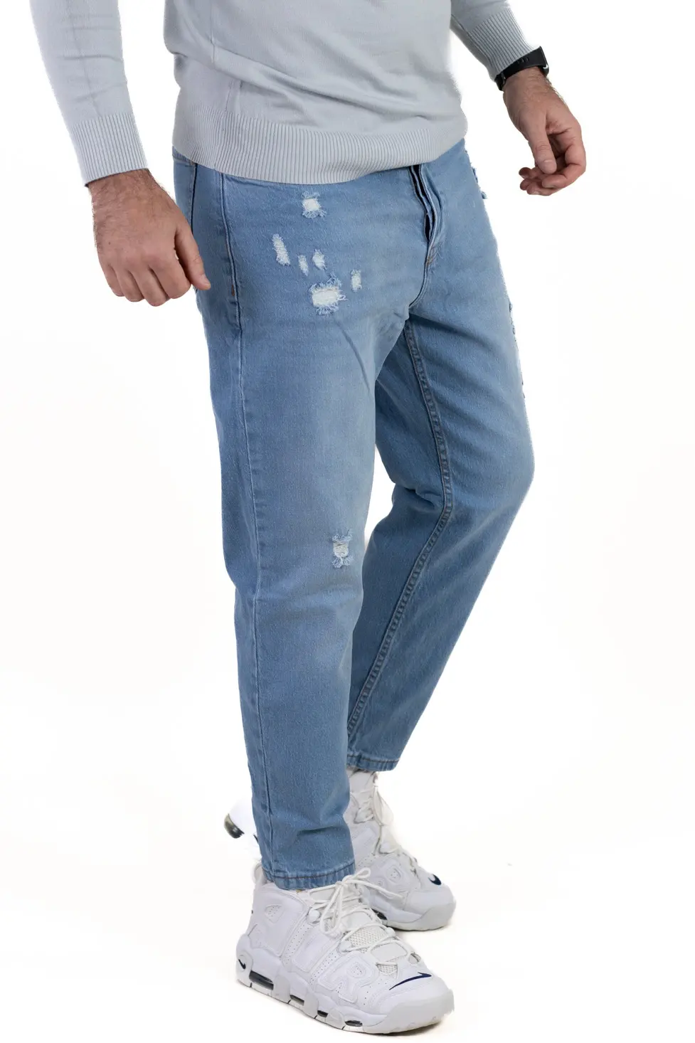 Blugi boyfriend pentru bărbați, realizați din denim sută la sută bumbac, cu textură naturală și respirabilă. Modelul este albastru deschis cu rupturi albe in contrast, cu efect prespălat, care oferă un aspect ușor estompat și modern, fără a încărca vizual ținuta. Croiala boyfriend este mai lejeră în zona șoldurilor și a coapselor, asigurând confort ridicat la purtare.