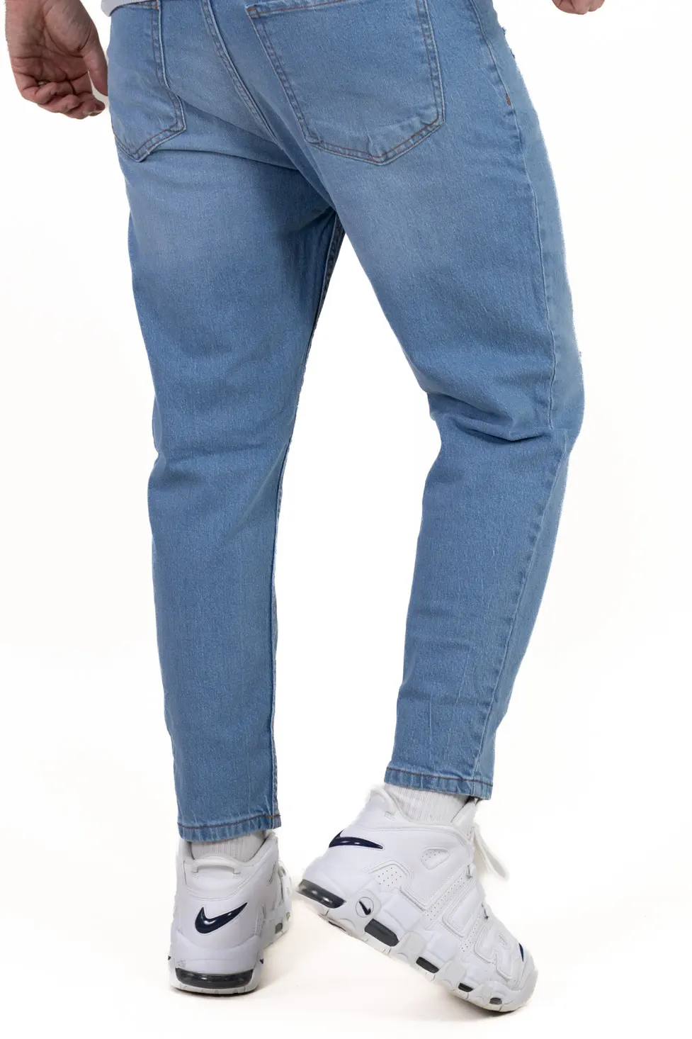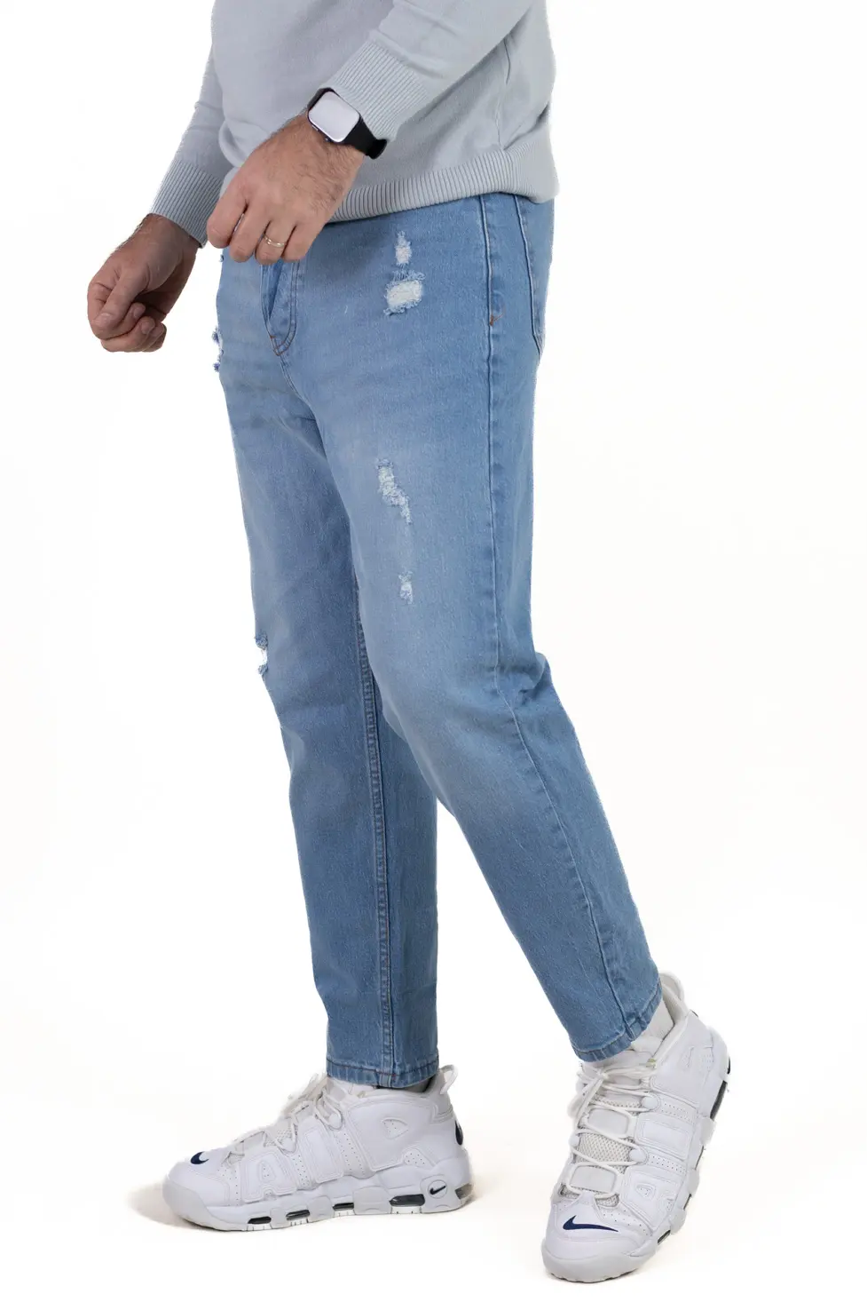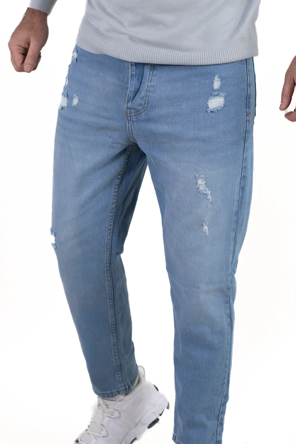 Blugi boyfriend pentru bărbați, realizați din denim sută la sută bumbac, cu textură naturală și respirabilă. Modelul este albastru deschis cu rupturi albe in contrast, cu efect prespălat, care oferă un aspect ușor estompat și modern, fără a încărca vizual ținuta. Croiala boyfriend este mai lejeră în zona șoldurilor și a coapselor, asigurând confort ridicat la purtare.