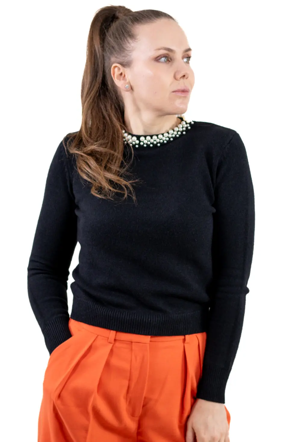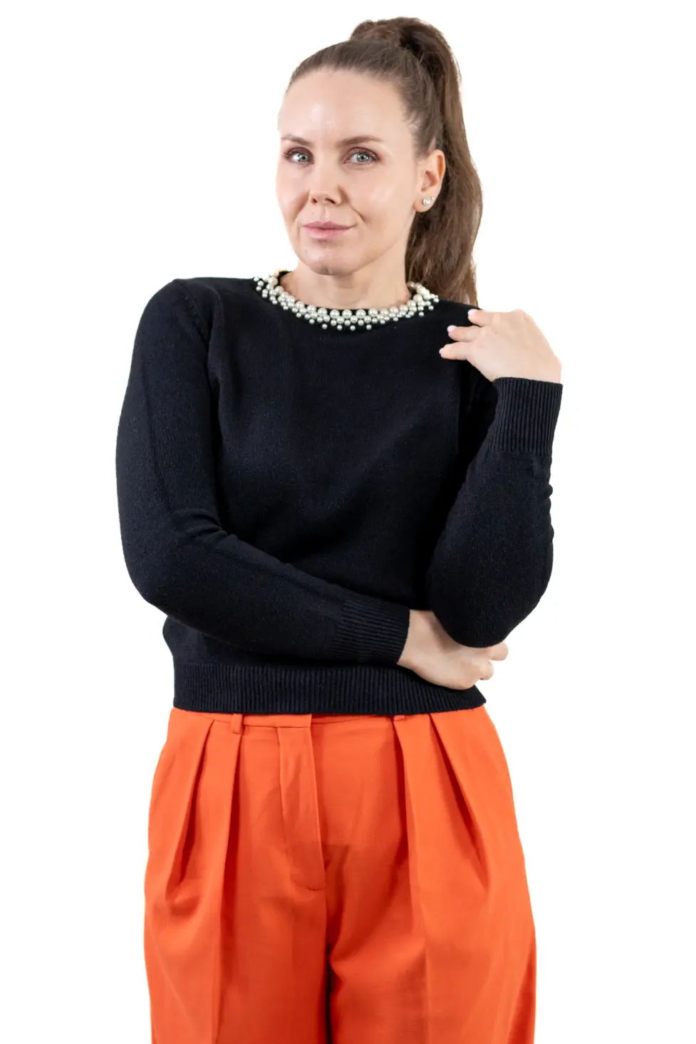 🔹 Detalii: guler rotund cu perle aplicate • mâneci lungi • terminație elastică