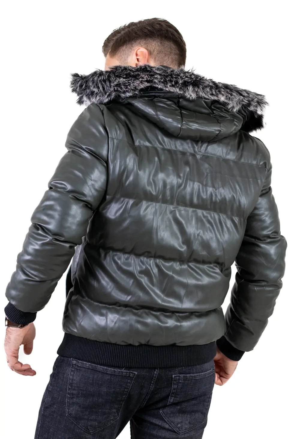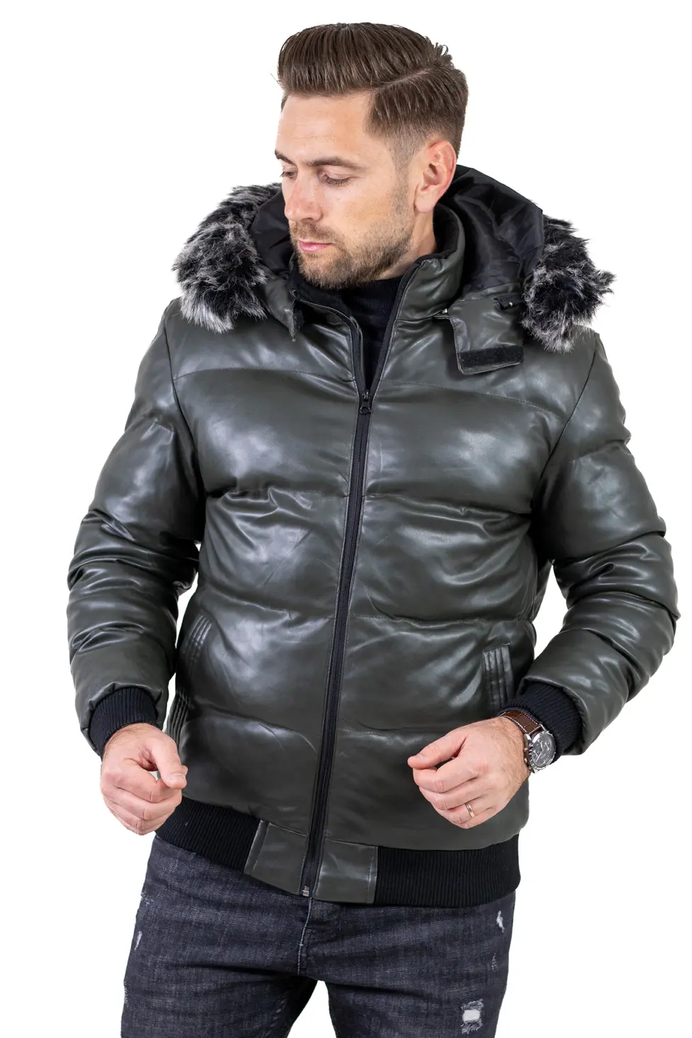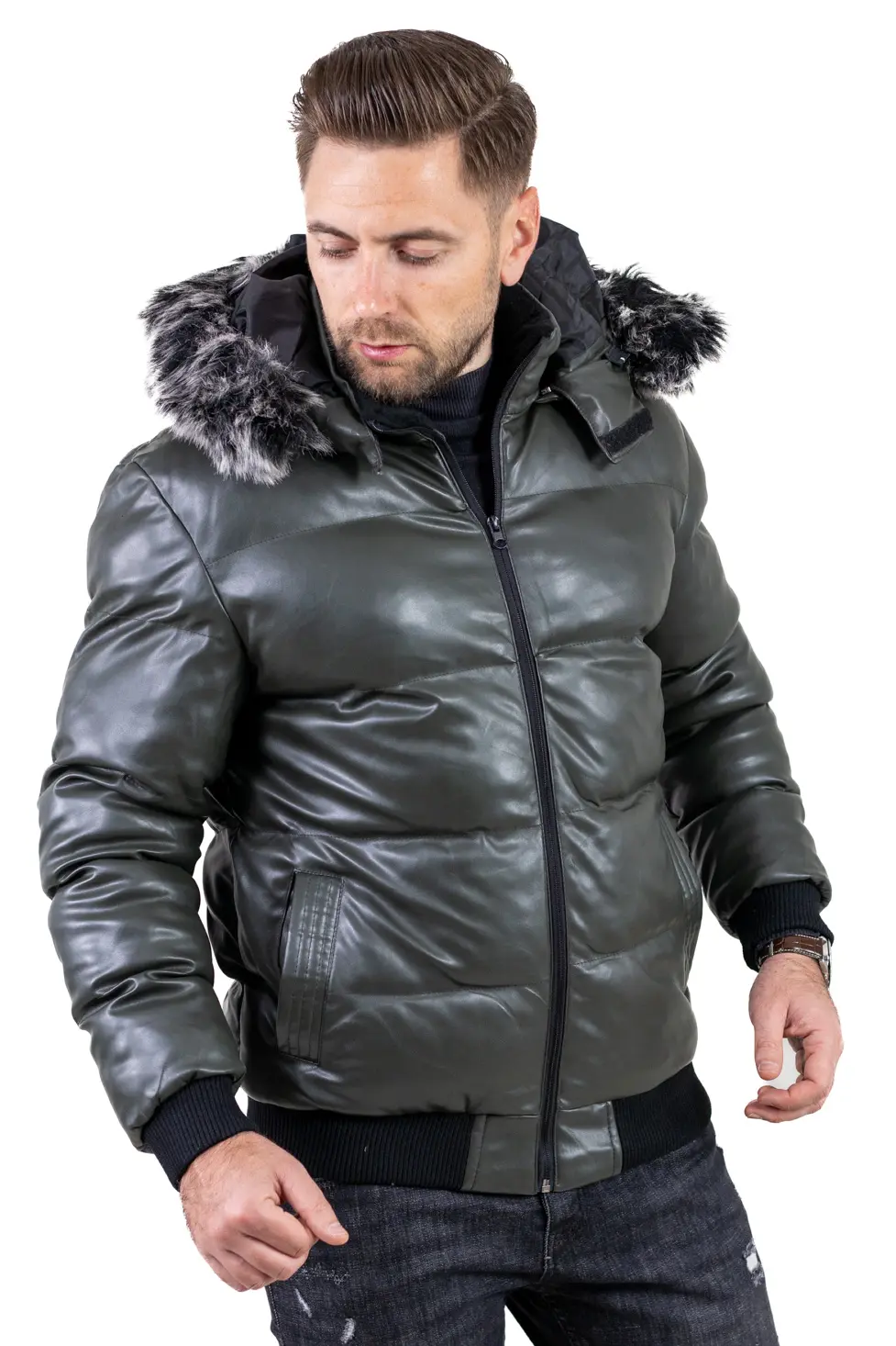 Geacă de iarnă bărbați din piele ecologică cu blăniță detașabilă – Verde