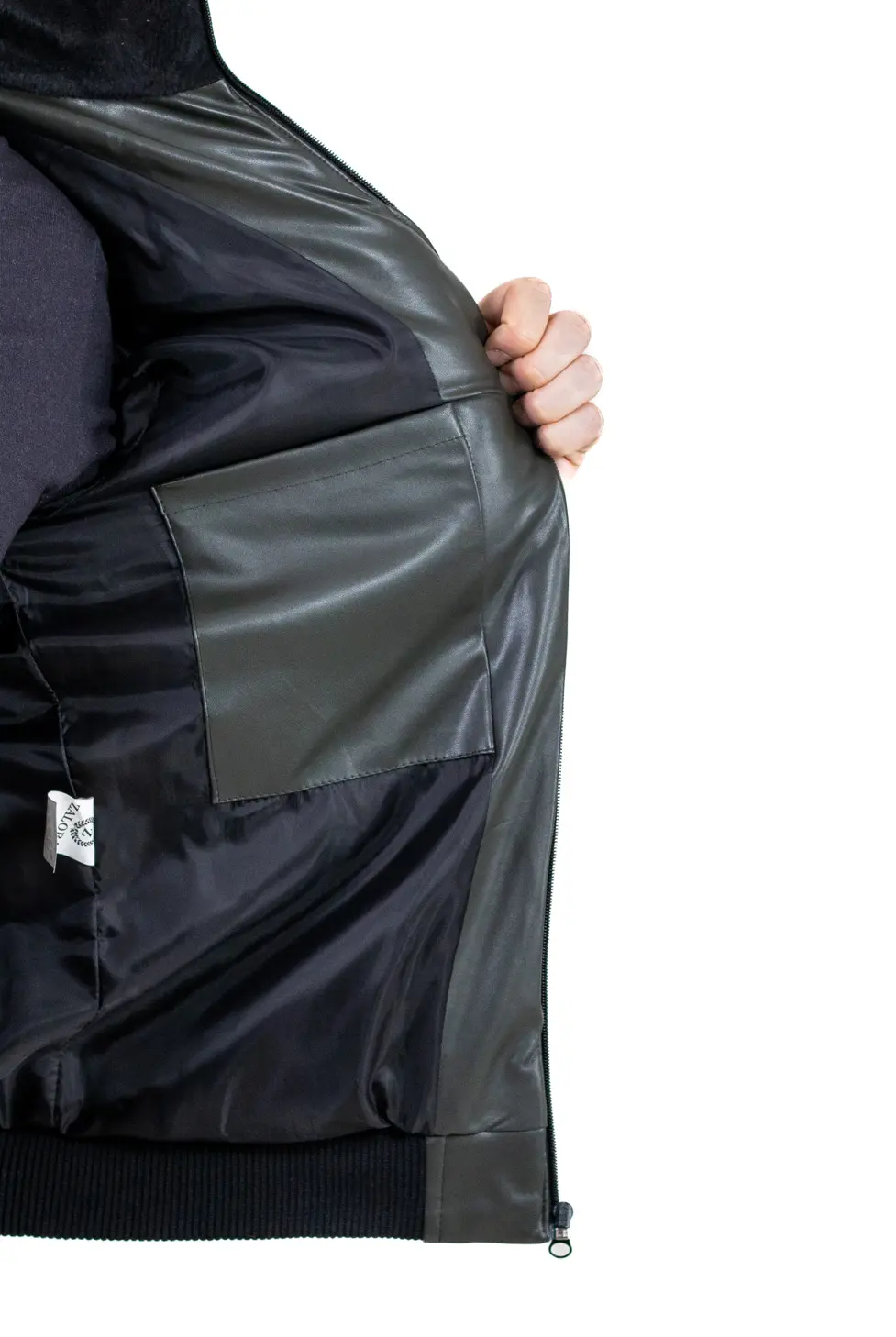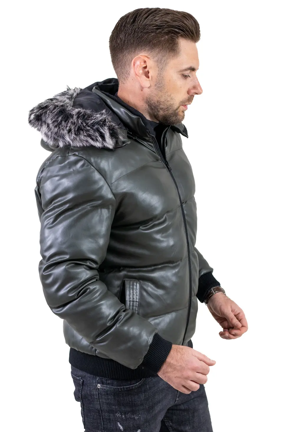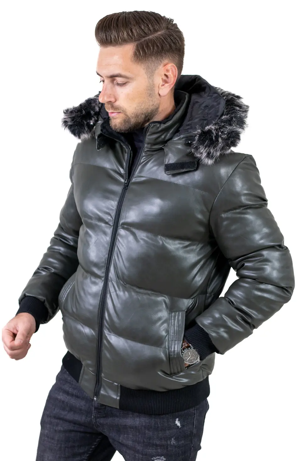 Geacă de iarnă bărbați din piele ecologică cu blăniță detașabilă – Verde
