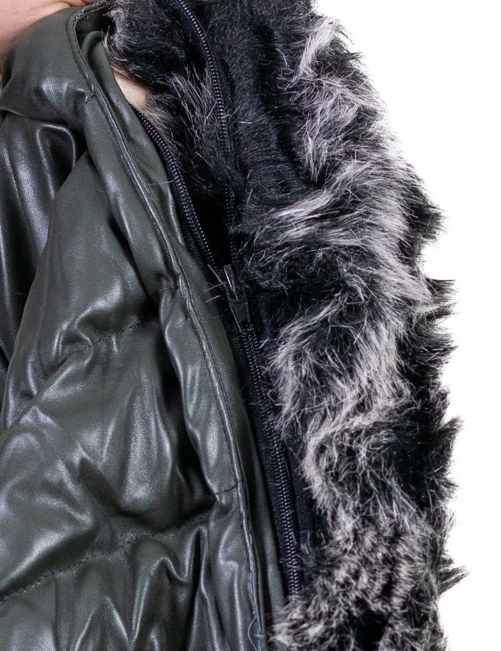 Geacă groasă de iarnă realizată din piele ecologică, cu un aspect modern și un plus de protecție termică. Interiorul este călduros, iar croiala permite mișcare lejeră în zilele reci. Gluga este prevăzută cu blăniță detașabilă, prinsă cu fermoar ascuns, ușor de scos și de montat.