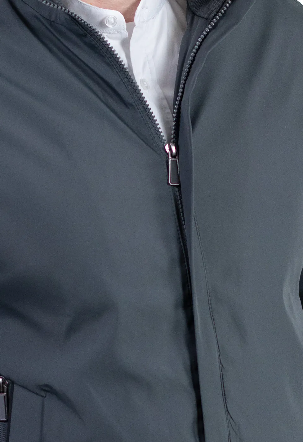 Modelul este prevăzut cu închidere frontală cu fermoar acoperit, două buzunare laterale cu fermoar și un buzunar interior, de asemenea cu fermoar, util pentru păstrarea în siguranță a obiectelor personale. Materialul exterior protejează împotriva vântului și a ploii ușoare, fără senzația rigidă, iar interiorul din bumbac contribuie la confortul zilnic.