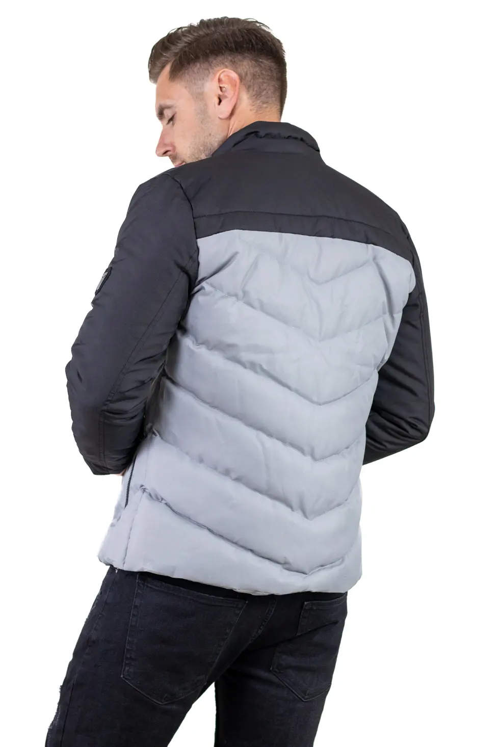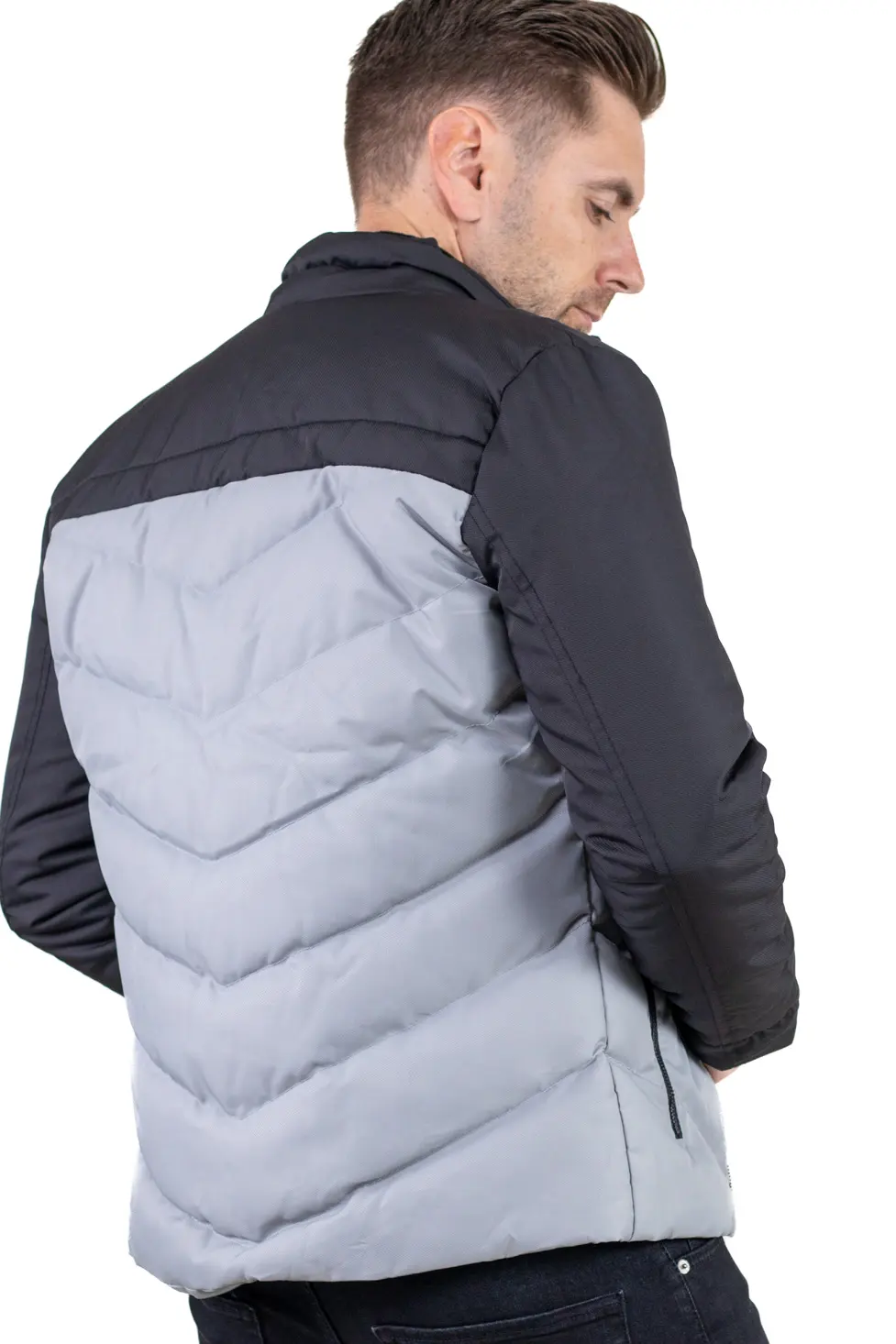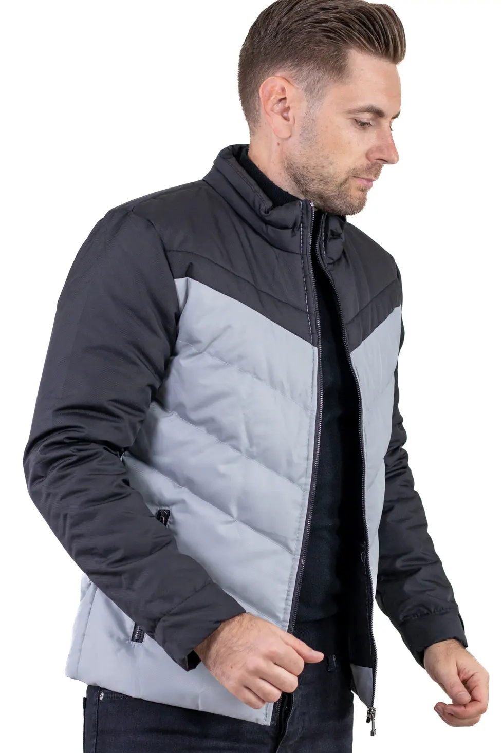 Designul în două culori (gri + negru) oferă un aspect modern și ușor de asortat, iar umplutura matlasată menține temperatura fără a încărca vizual sau ca greutate. Închiderea frontală este cu fermoar, iar buzunarele laterale sunt prevăzute tot cu fermoar, pentru siguranță. Include și un buzunar interior pentru acte, telefon sau portofel.