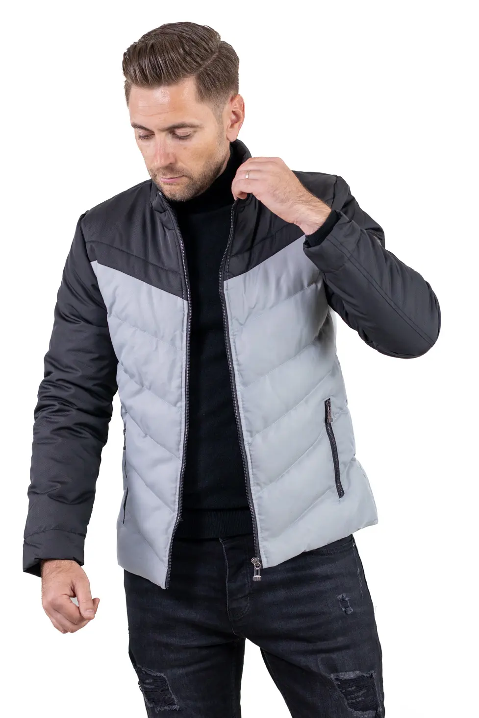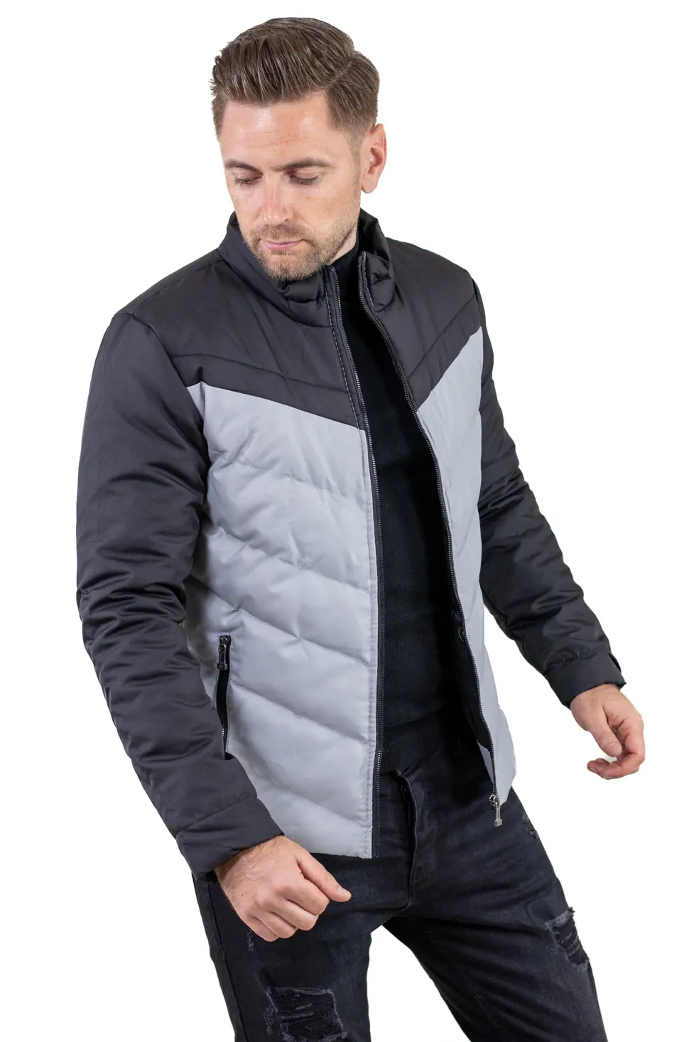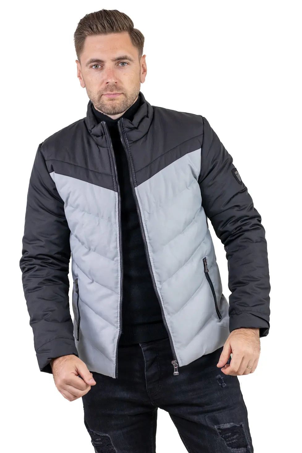 Designul în două culori (gri + negru) oferă un aspect modern și ușor de asortat, iar umplutura matlasată menține temperatura fără a încărca vizual sau ca greutate. Închiderea frontală este cu fermoar, iar buzunarele laterale sunt prevăzute tot cu fermoar, pentru siguranță. Include și un buzunar interior pentru acte, telefon sau portofel.
