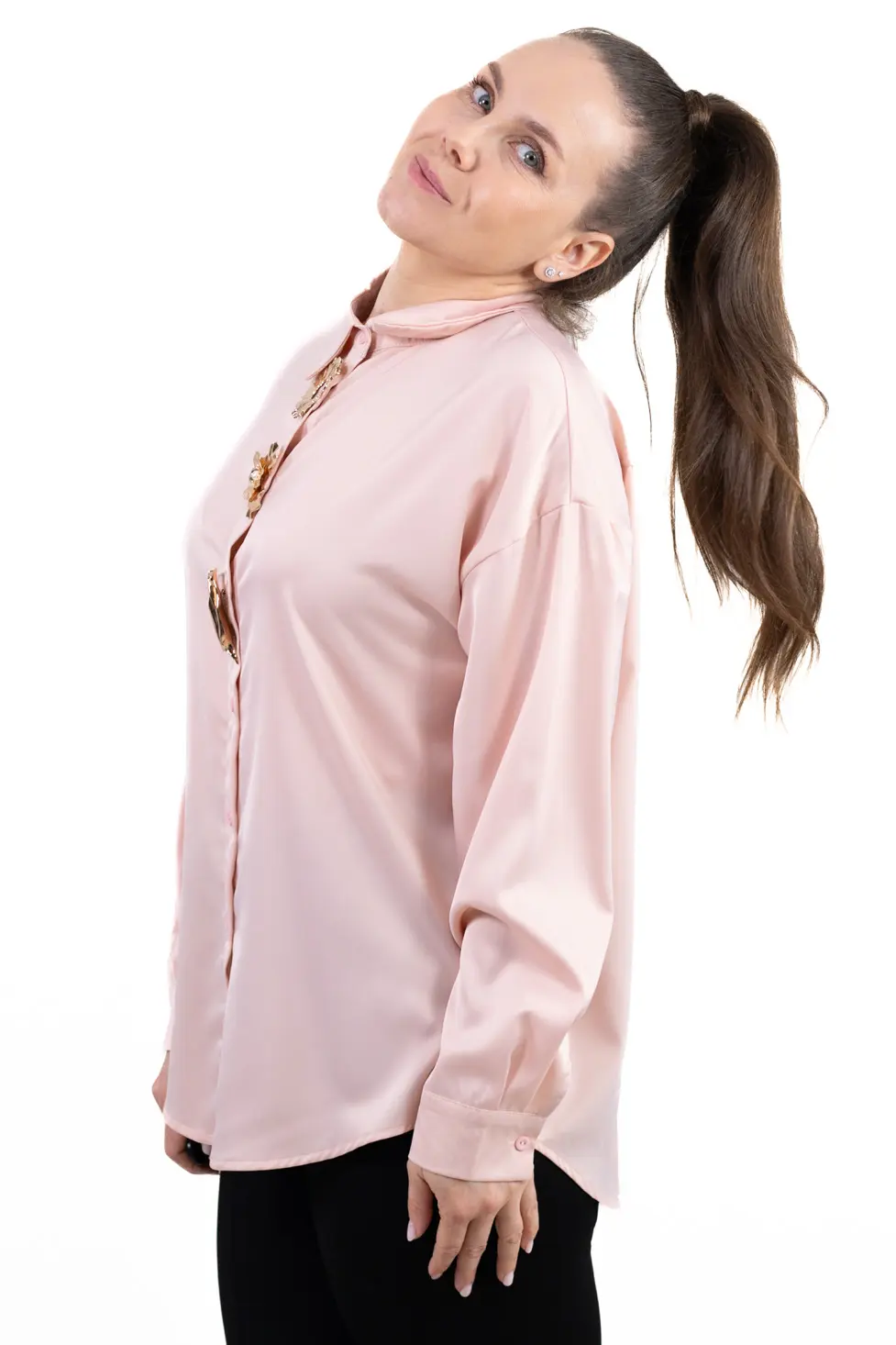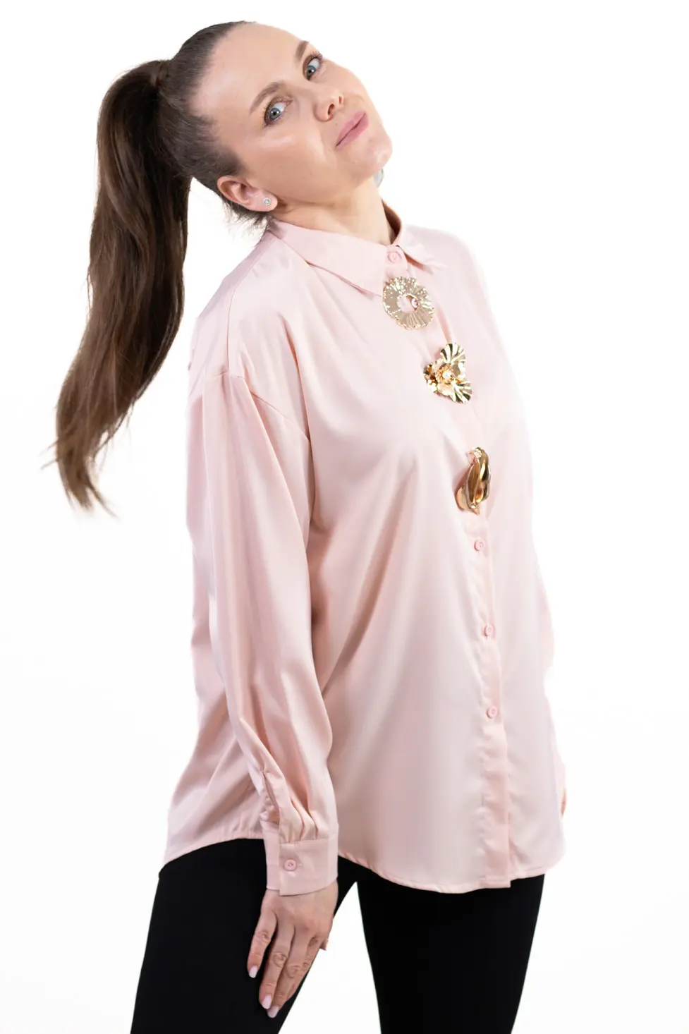 Cămașă oversize pentru femei, realizată dintr-un material fluid și lejer, cu un aspect satinat plăcut la atingere. Modelul se remarcă prin cele trei aplicații metalice decorative, dispuse vertical pe linia nasturilor, transformând o cămașă clasică într-o piesă statement. Croiala largă asigură confort și libertate de mișcare, fiind potrivită atât pentru ținute casual, cât și smart-casual sau outfituri de birou moderne.
