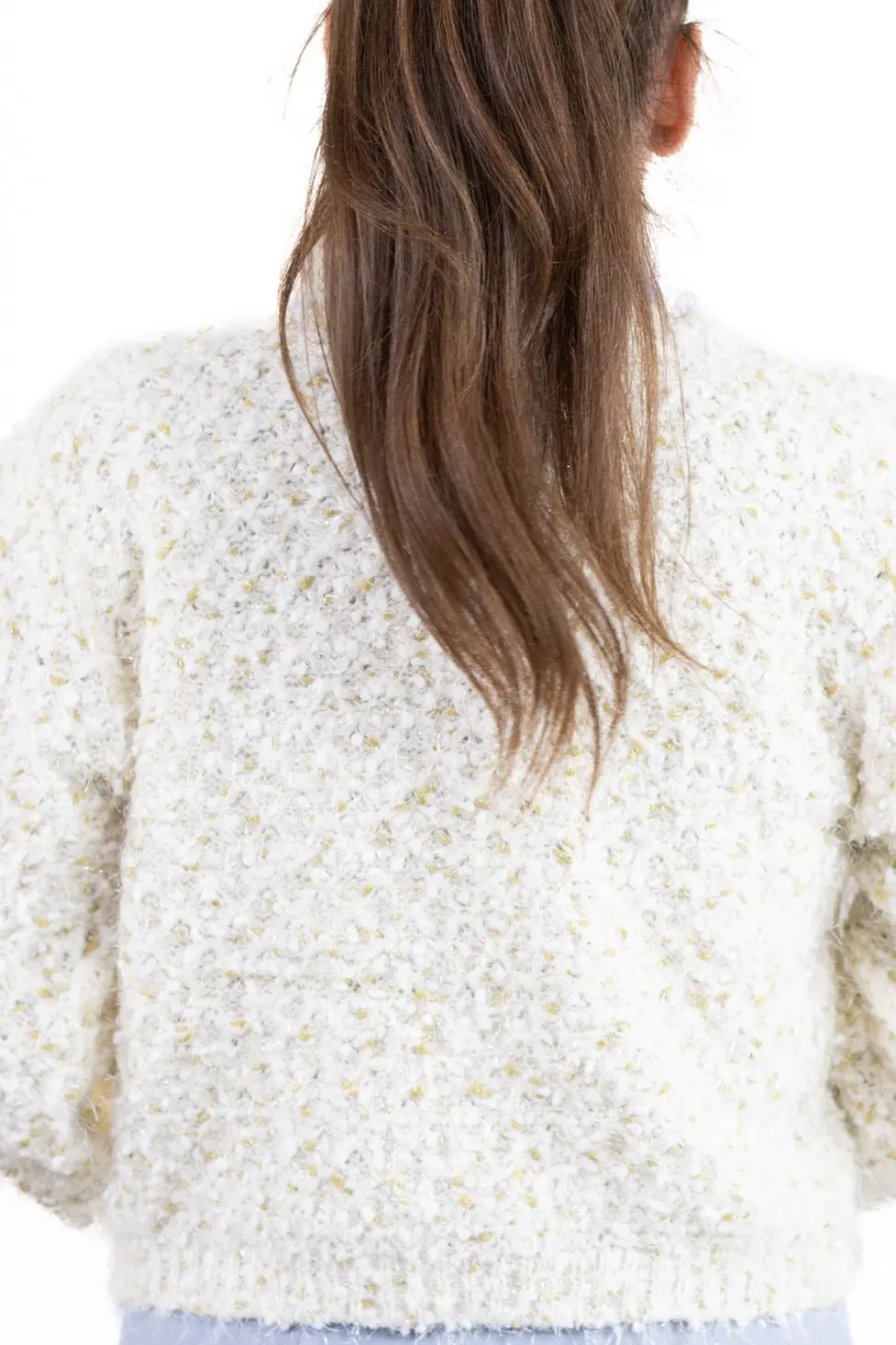 Cardigan scurt pentru femei, realizat dintr-un tricot buclé moale și texturat, cu fir reliefat și inserții discrete. Modelul are o linie lejeră, se închide cu nasturi tip perlă și este prevăzut cu două buzunare frontale decorative. Materialul este elastic și plăcut pe piele, iar croiala îl face ideal pentru layering peste cămăși, topuri sau bluze.