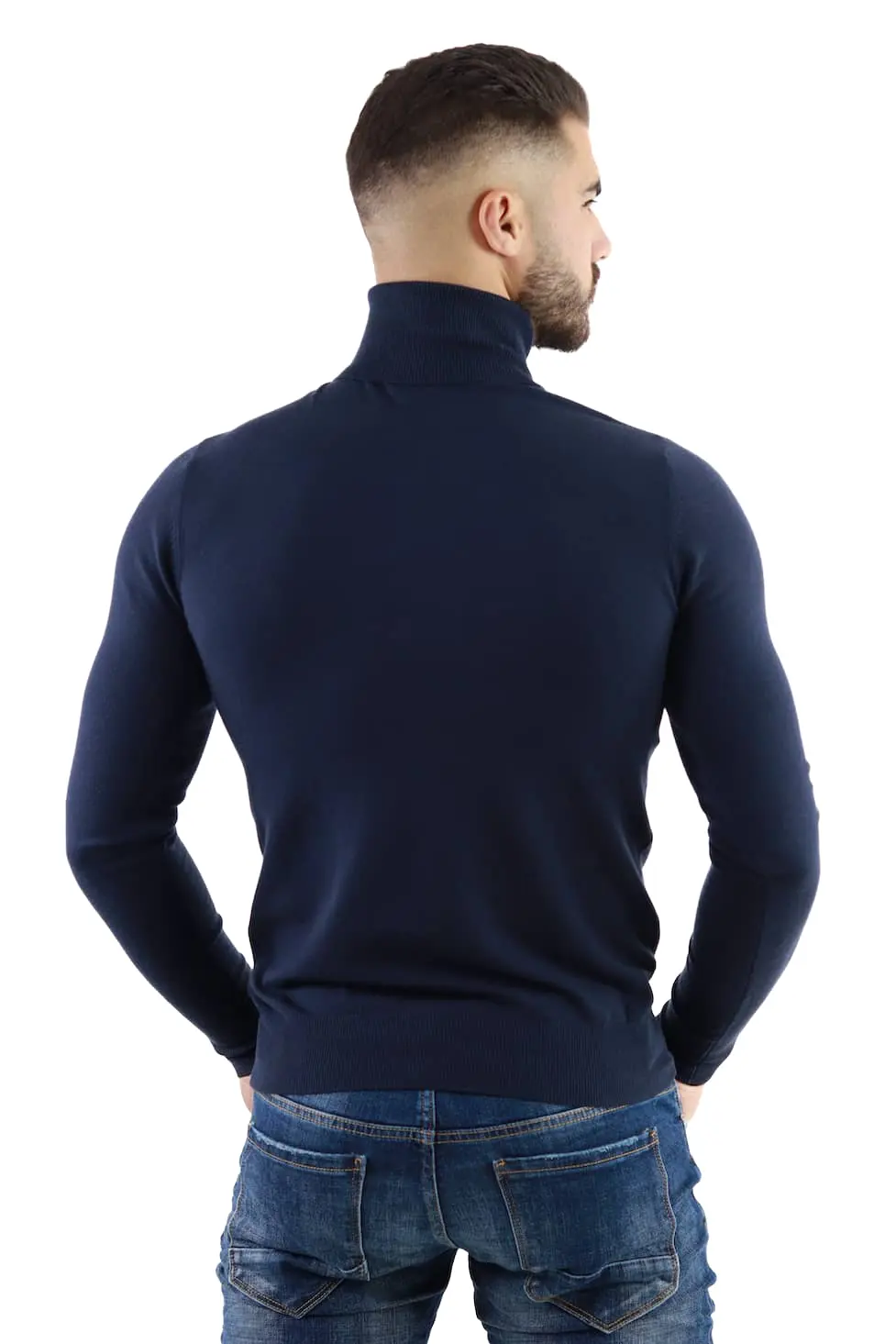 Pulover (maleta) cu croială slim fit. Guler intors, inalt . Culoare bleumarin. Mânecă lungă. Material foarte fin la atingere, tip cașmir. Foarte confortabil datorita elasticitatii. Compozitie material: 50% vascoza 28% spandex 22% elastan