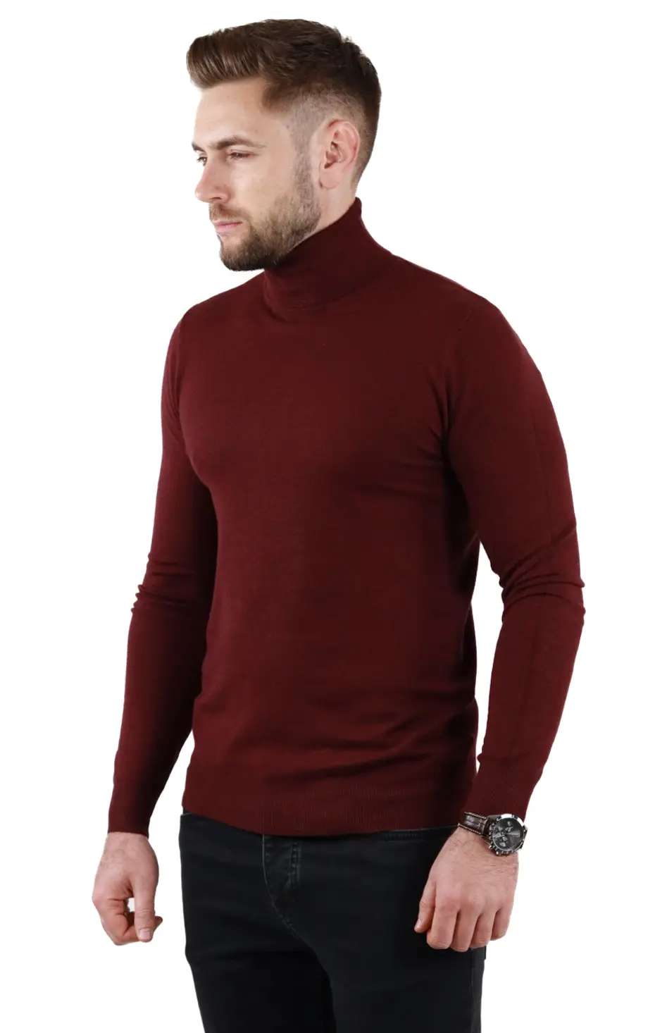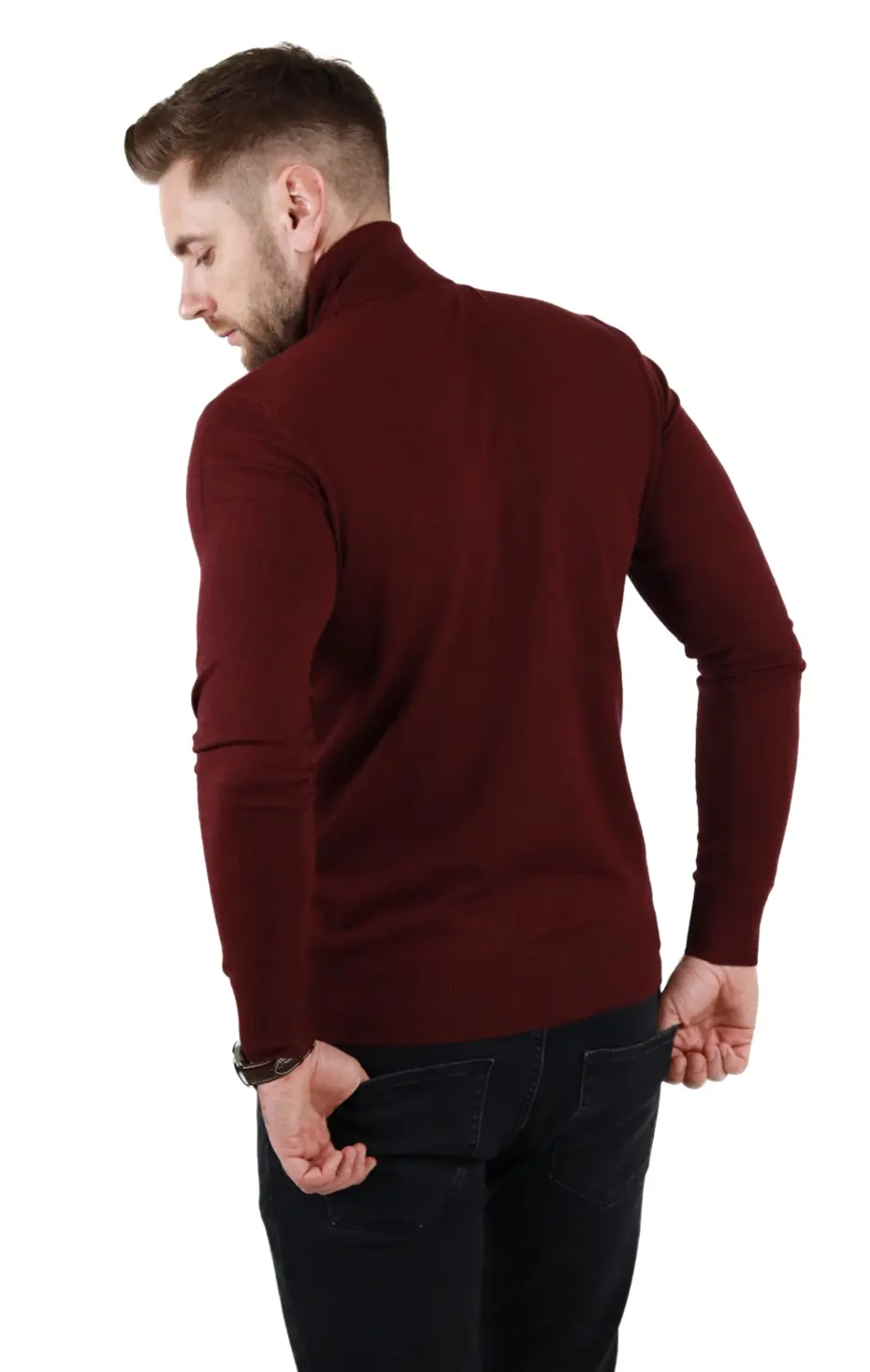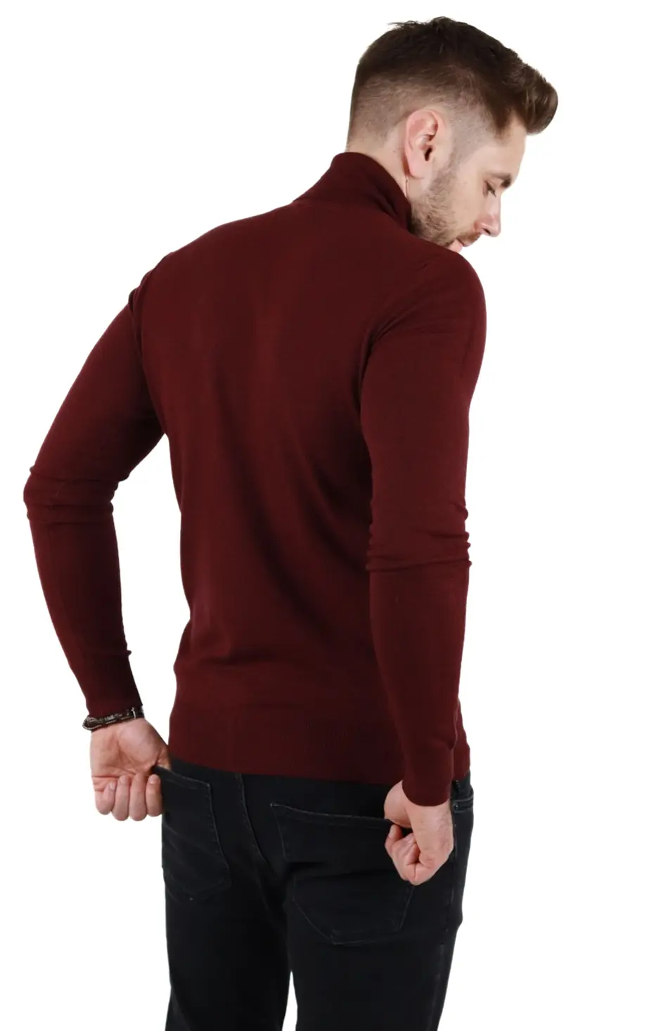 Pulover (maleta) cu croială slim fit. Guler intors, inalt . Culoare visiniu. Mânecă lungă. Material foarte fin la atingere, tip cașmir. Foarte confortabil datorita elasticitatii. Compozitie material: 50% vascoza 28% spandex 22% elastan