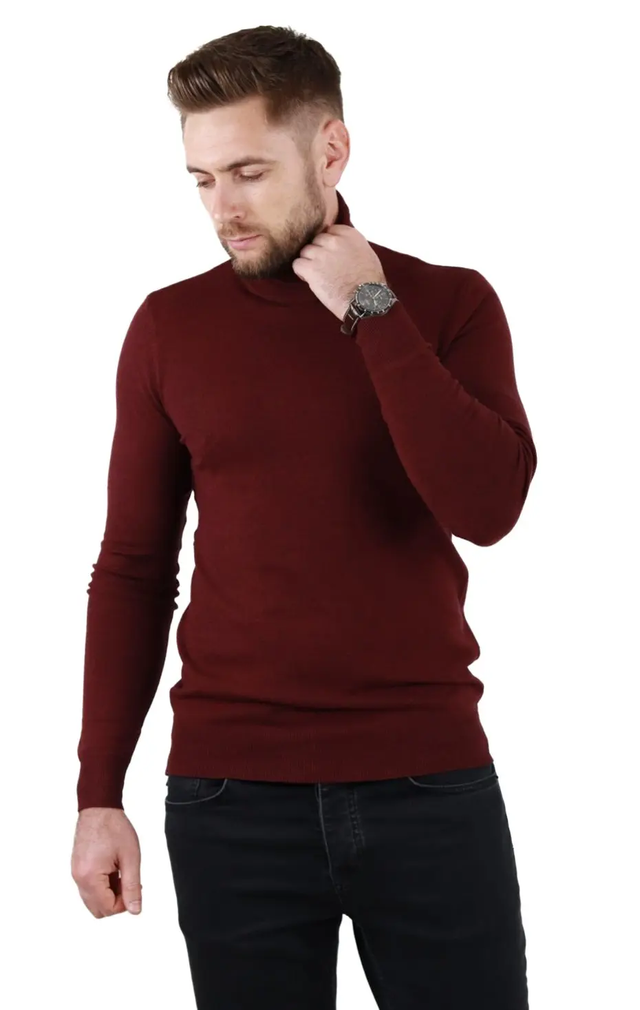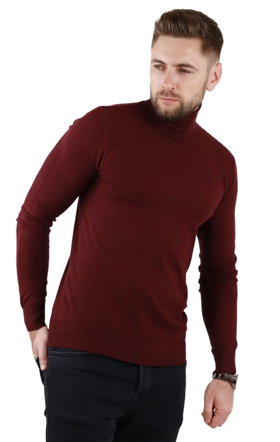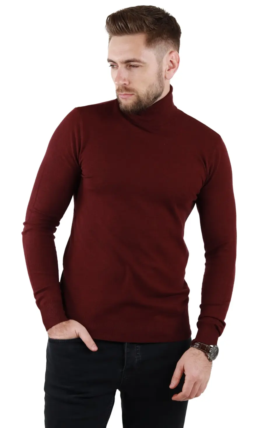Pulover (maleta) cu croială slim fit. Guler intors, inalt . Culoare visiniu. Mânecă lungă. Material foarte fin la atingere, tip cașmir. Foarte confortabil datorita elasticitatii. Compozitie material: 50% vascoza 28% spandex 22% elastan