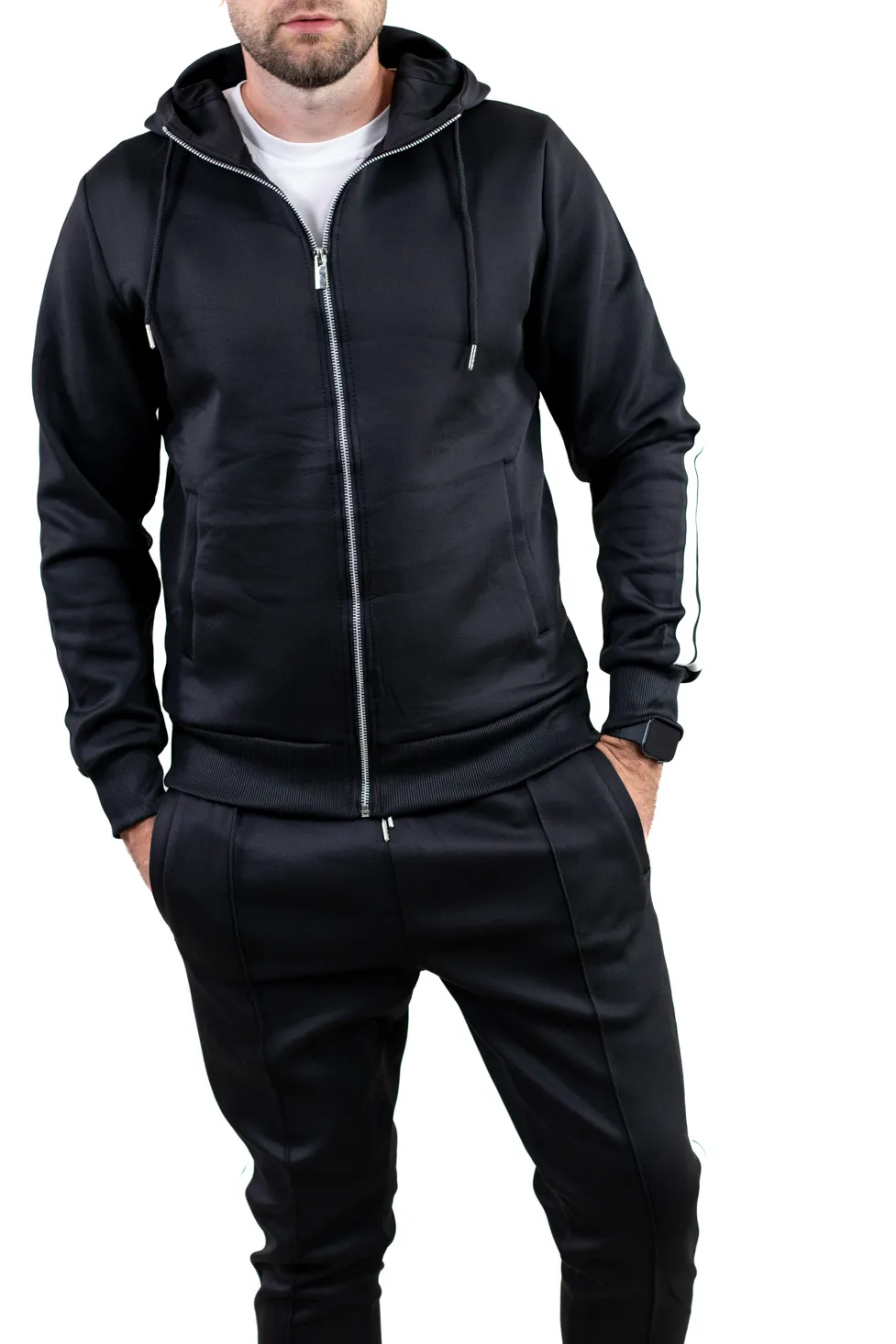 Compleu sport bărbați din material tehnic de calitate superioară, compoziție 95% poliester și 5% elastan, ideal pentru ținute lejere și moderne. Bluza are glugă practică cu șnur reglabil, închidere cu fermoar metalic și buzunare laterale. Pantalonii vin cu o croială slim, dunga cusută pe mijloc pentru un look stilat și benzi laterale albe, asortate cu bluza, care conferă un aer sportiv și dinamic.